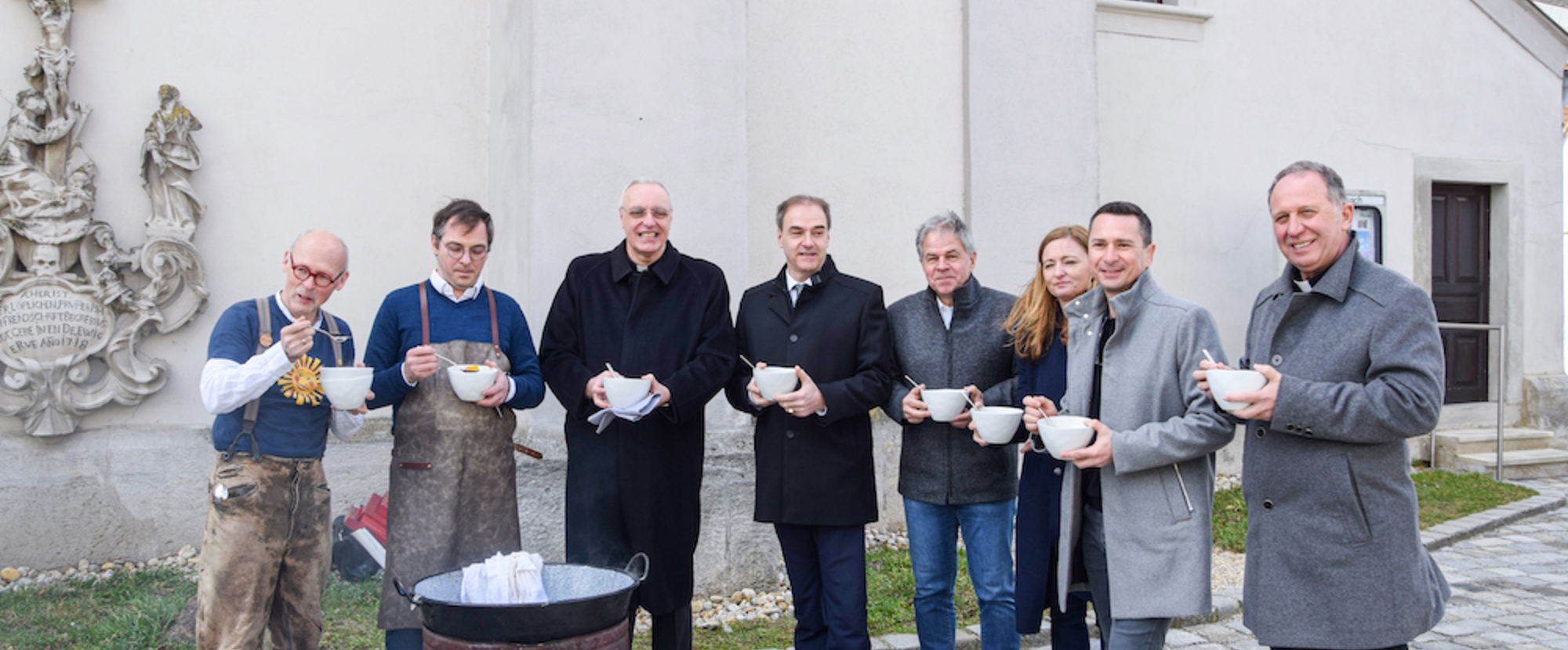 Bischof Zsifkovics lud am 12. März 2021 zu einem gemeinsamen Fastensuppen-Kochen mit Max Stiegl und Hannes Gutmann nach Purbach, vor die Pfarrkirche, ein.