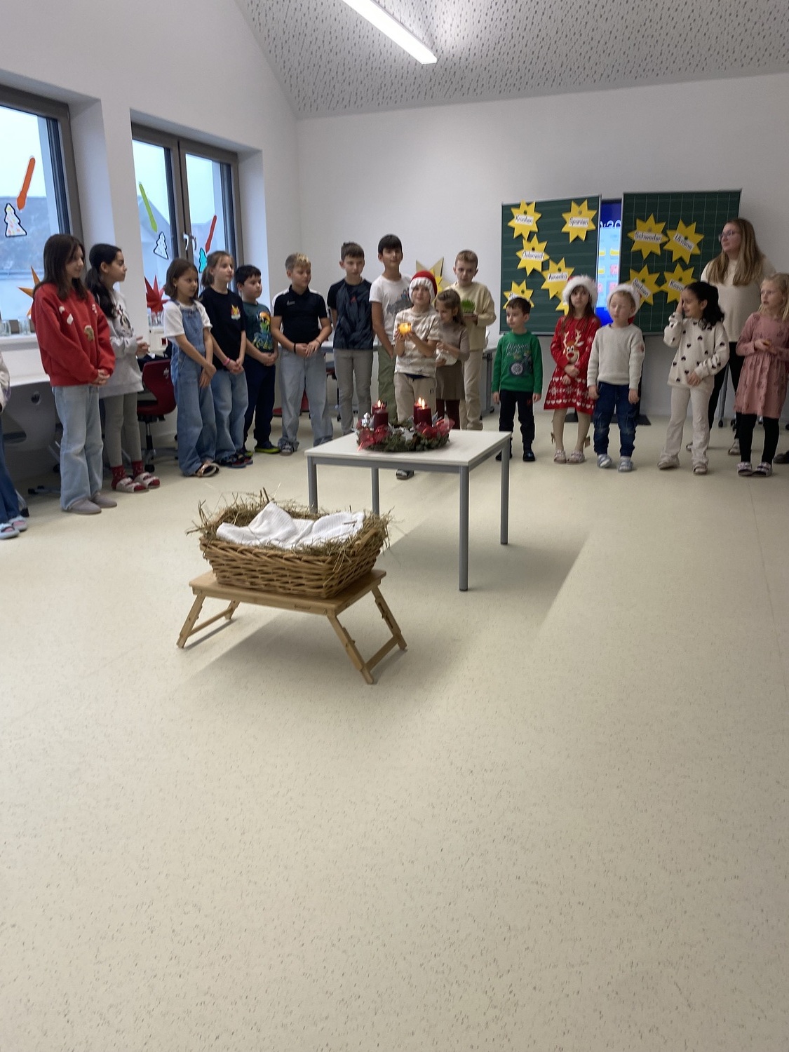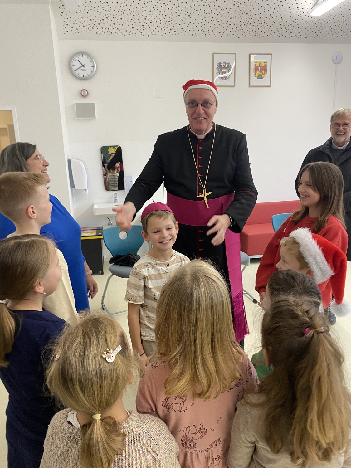 Nach einer stimmungsvollen gemeinsamen Adventandacht im Turnsaal, die von Religionslehrerin Maria Wiesinger zum Thema „Licht im Advent“ gestaltet wurde, nahm sich der Herr Bischof Zeit für den Besuch von drei Klassen. Die mitgebrachte Mitra und der besondere Bischofsstab des Herrn Diözesanbischofs weckten großes Interesse bei den neugierigen Schüler:innen. Besonders beeindruckt zeigte sich der Herr Bischof von einer Mehrstufenklasse, in der Schülerinnen und Schüler aller vier Schulstufen engagiert Fragen stellten und miteinander ins Gespräch kamen. Ein kulinarisches Beisammensein mit dem Kollegium bot anschließend Gelegenheit zum persönlichen Austausch.