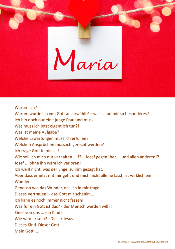 Sie reden nicht viel die Zwei. Aber manchmal sprechen sie über einen Gott ... der sie führt ... der ihnen sagt, was sie tun sollen ... damit er – Gott? – auf die Welt kommen kann ... geboren, von der Frau, die ich trage ... ?!?