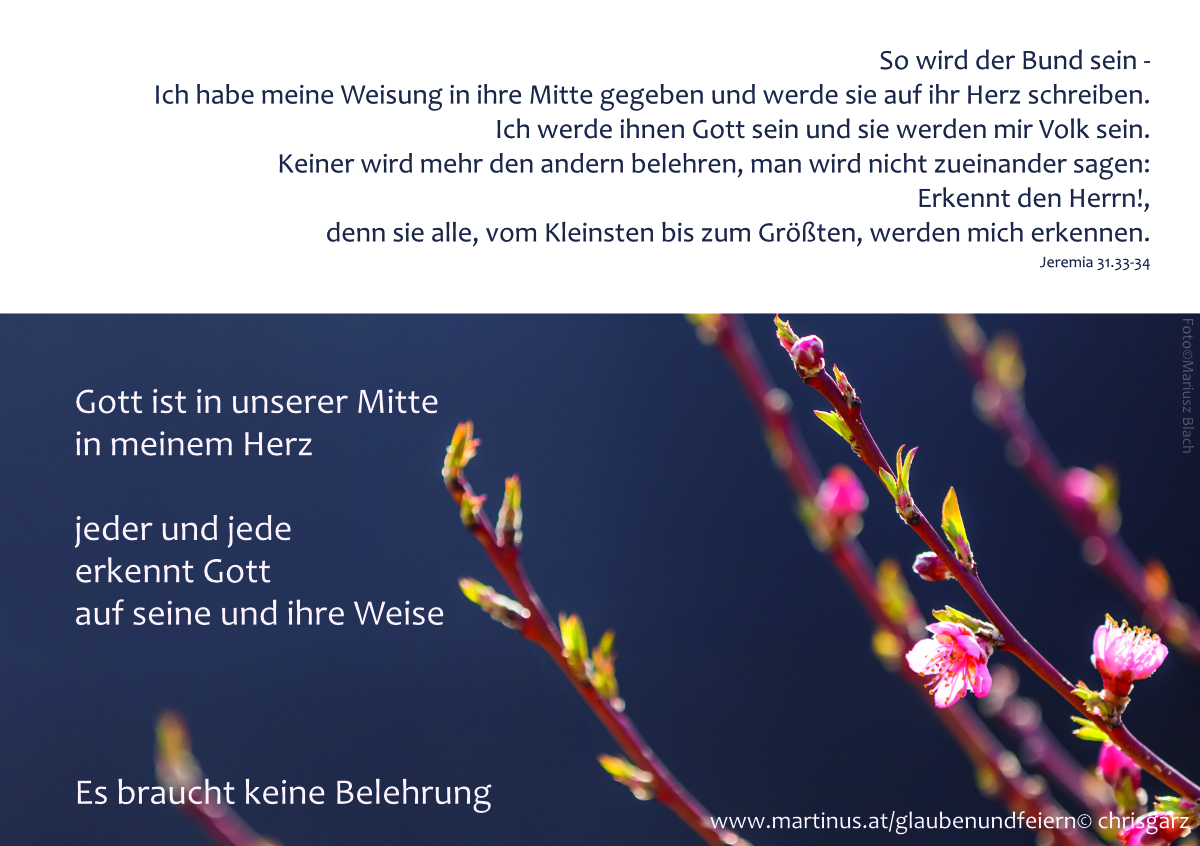 Keiner wird mehr den andern belehren, man wird nicht zueinander sagen: Erkennt den Herrn!, denn sie alle, vom Kleinsten bis zum Größten, werden mich erkennen.