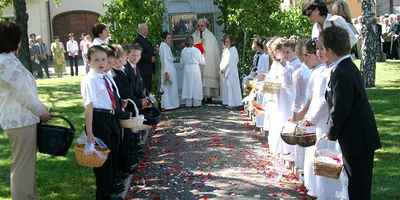 Die bleibende Gegenwart von Jesus Christus wird im Sakrament der Eucharistie feiert. Wir feiern Fronleichnam am zweiten Donnerstag nach Pfingsten oder 60 Tage nach Ostern. Höhepunkt an diesem Tag sind die Fronleichnamsprozession.