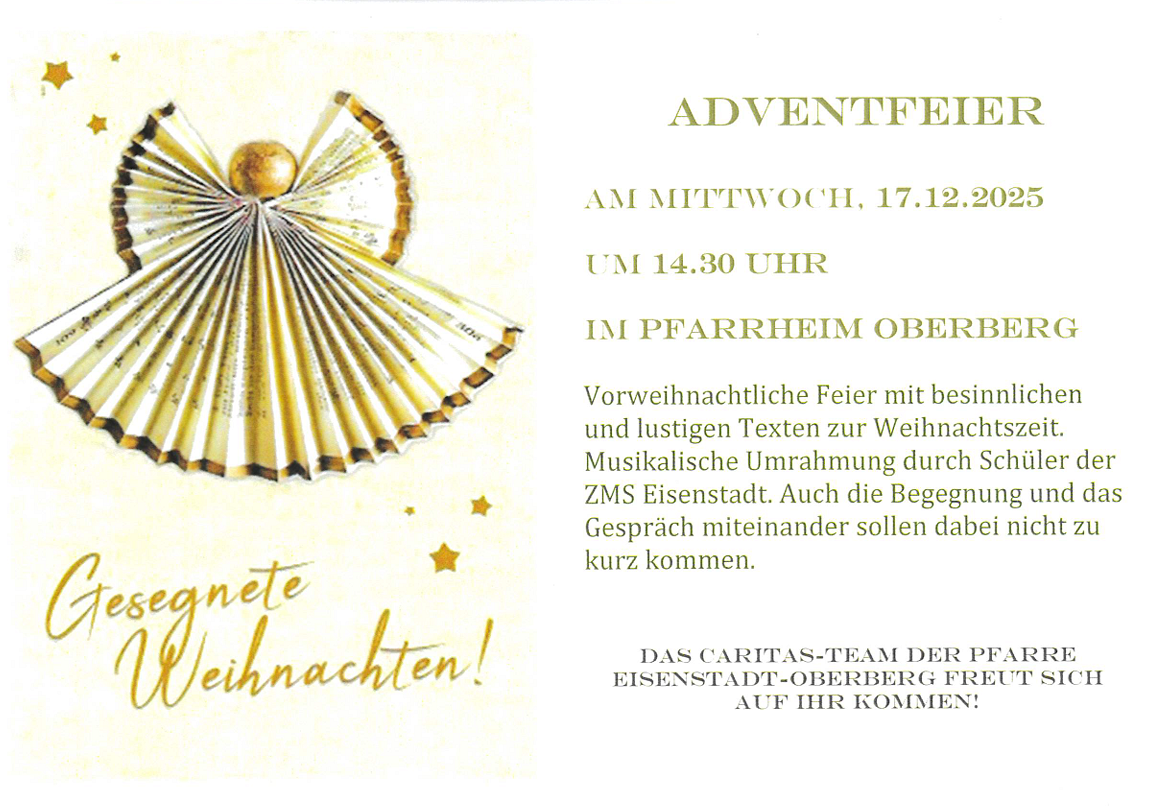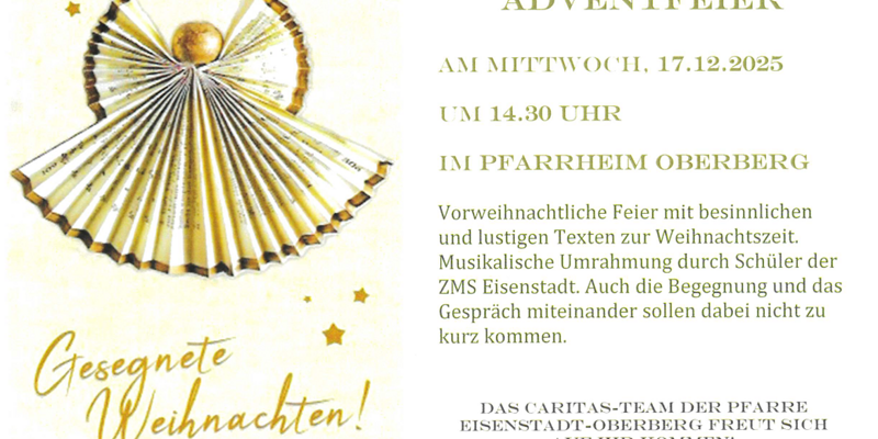 Die Adventsfeier am 17. Dezember war sehr gut besucht und bildete den Jahresabschluss des Seniorencafés. Der Saal des Pfarrheims war bis auf den letzten Platz gefüllt. Besinnliche Gedanken, lustige Texte, Gesang und Musik der Zentralmusikschule Eisenstadt sowie die Segnung durch den Pfarrer prägten die festliche Atmosphäre.