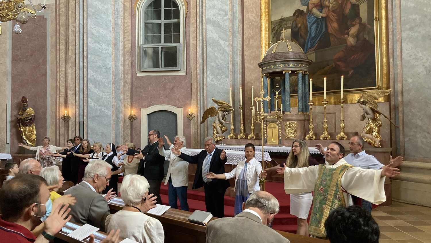 Den Mittelpunkt des Pfarrfestes am 26. Juni 2022 am Oberberg bildete der Gottesdienst, bei dem die Mitglieder von Pfarrgemeinderat und Wirtschaftsrat als Stärkung für die neue Amtsperiode von Pfarrer Alexander gesegnet wurden. Anschließend sangen alle gemeinsam "Gottes Liebe ist so wunderbar" und konnten sich mit den Bewegungen zu "So hoch – was kann höher sein? So tief – was kann tiefer sein? So weit – was kann weiter sein?" schon einmal für die nächste Pfarrgemeinderatssitzung aufwärmen.