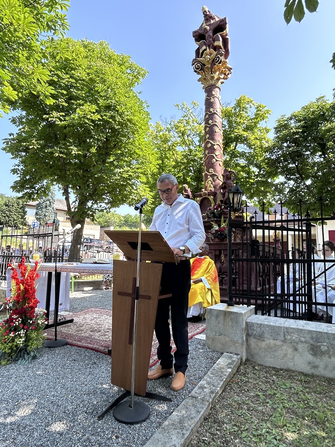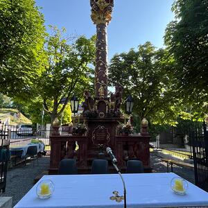Bei strahlendem Wetter feierten wir heute im Pfarrverband eine besonders festliche hl. Messe im Freien – vor der eindrucksvollen Kulisse unserer Dreifaltigkeitssäule.