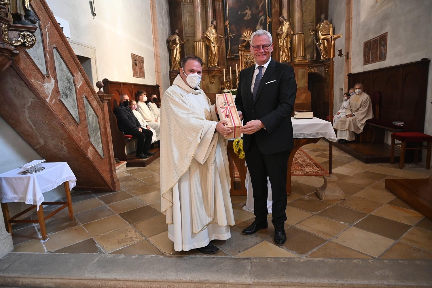 "Pfarrer" Alexander Wessely wurde neben Bürgermeister Thomas Steiner auch von Ratsvikarin Doris Fennes-Wager herzlich Willkommen geheißen und erhielt symbolisch die Schlüsses der Pfarrkirche Kleinhölfein, einen Weinkorb der Kleinhöfleiner Winzer und einen Allerheiligen Striezel.