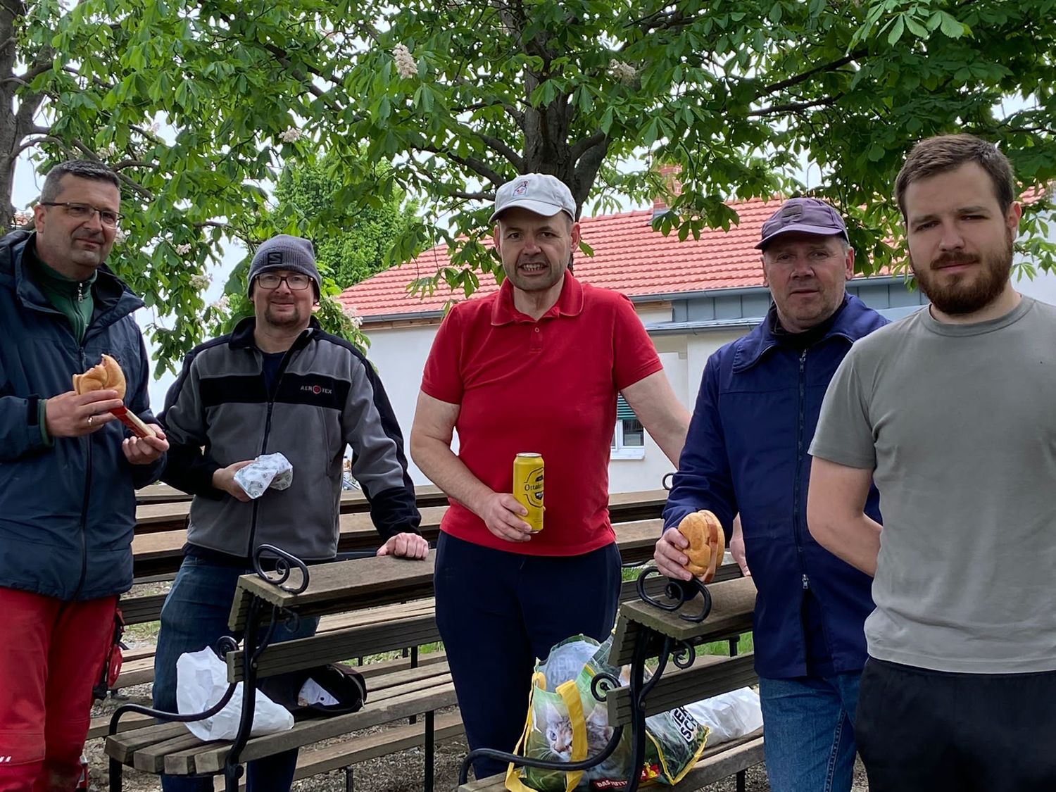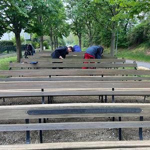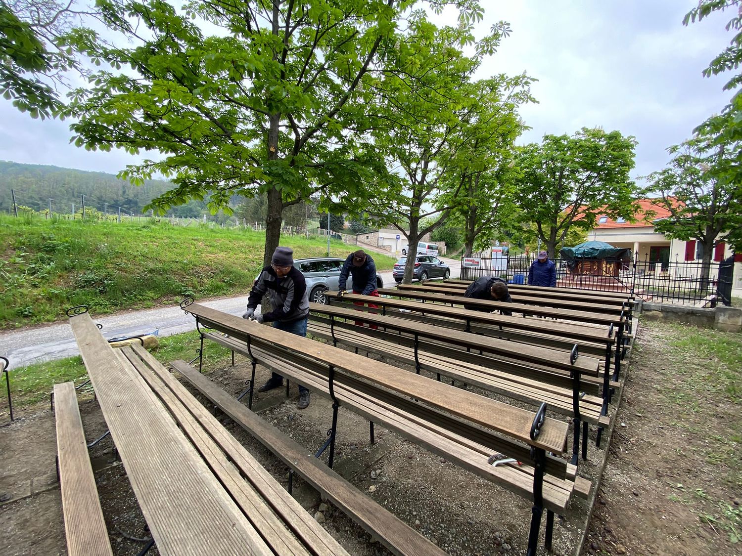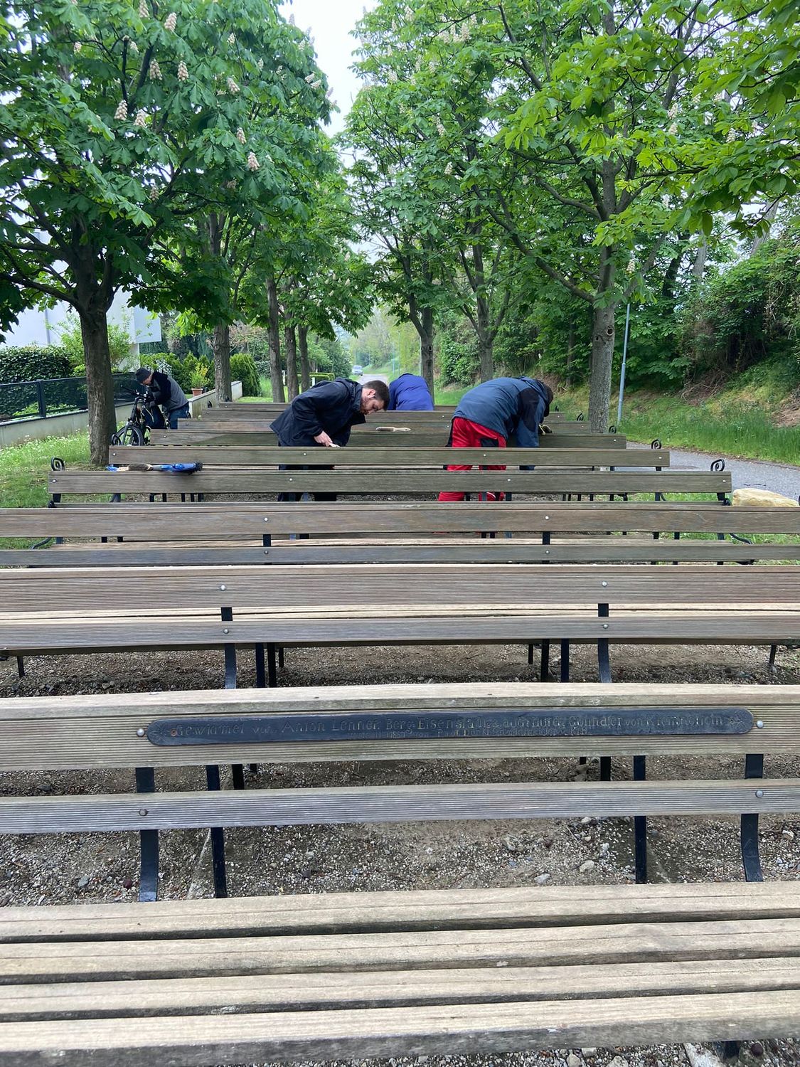 Im Zuge der Sanierung werden seitens der Pfarre auch die Sitzbänke in Eigenregie renoviert. Am Samstag, 7.5.2022 trafen sich einige Pfarrmitglieder um die verwitterten Sitzgelegenheiten rund um die Säule wieder auf Vordermann zu bringen. Diese werden abgeschliffen, grundiert und neu eingelassen, damit auch sie bei der Segnung am 12. Juni 2022 wieder in neuem Glanz erstrahlen und zum Verweilen einladen.