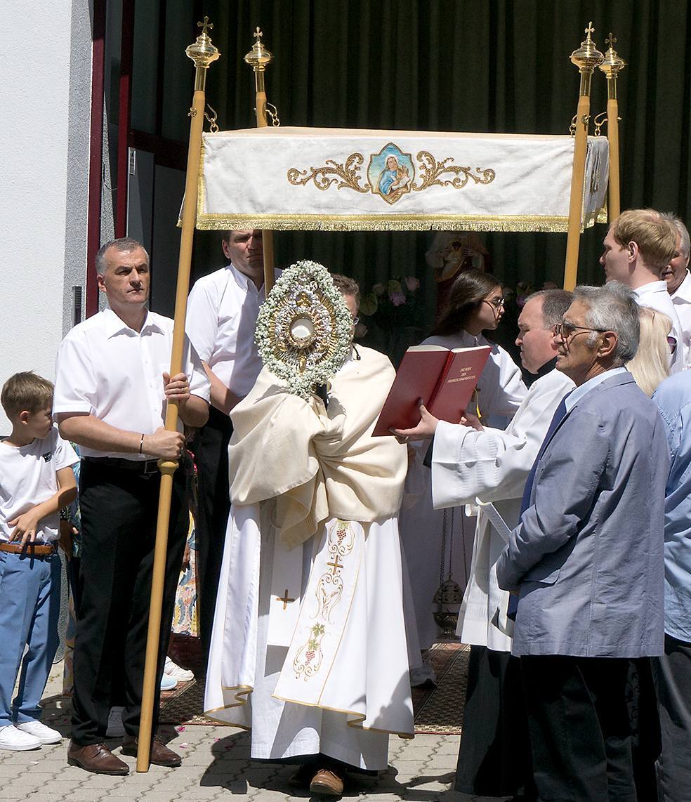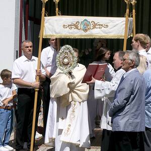 Fronleichnam fand heuer am 30. Mai 2024 statt. Nach der heiligen Messe führte eine Prozession auf der Hauptstrasse zu den vier Altären, Pfarrmoderator Jahns trug das Allerheiligste in der festlich geschmückten Monstranz, das von einem "Himmel" (Stoffbaldachin) beschirmt wurde. Die Prozession wurden von der Feuerwehr und dem Jungenblasmusikverein begleitet, die Erstkommunionkinder streuten Blumen vor dem Allerheiligsten. Früher war es üblich, entlang der Straße grüne Birken aufzustellen,