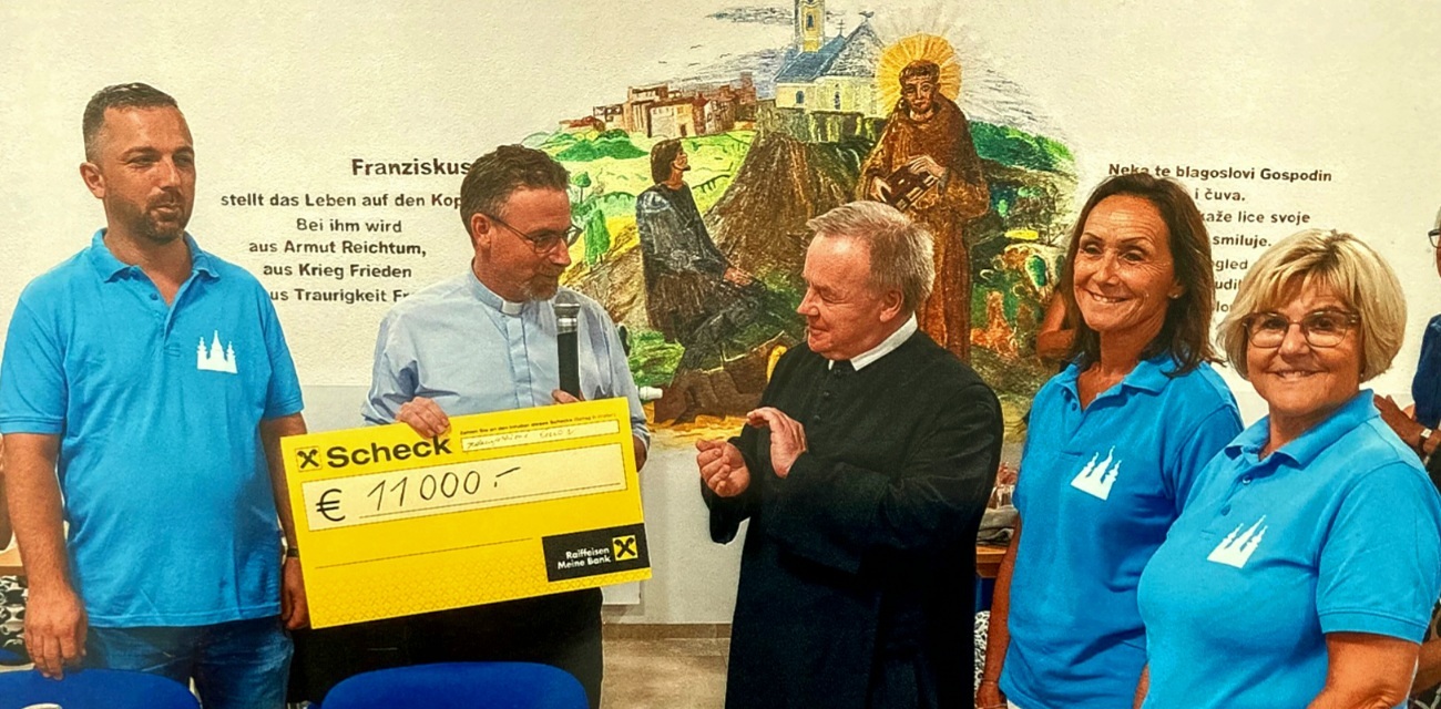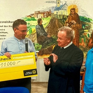 Pfarrer Mag. Stefan Jahns durfte Superior P. Michael Staberl für die Basilika Mariazell eine Spende von 11.000 Euro von den Wallfahrern, die nach Wulkaprodersdorf zur Wandermuttergottes pilgerten, überreichen.
