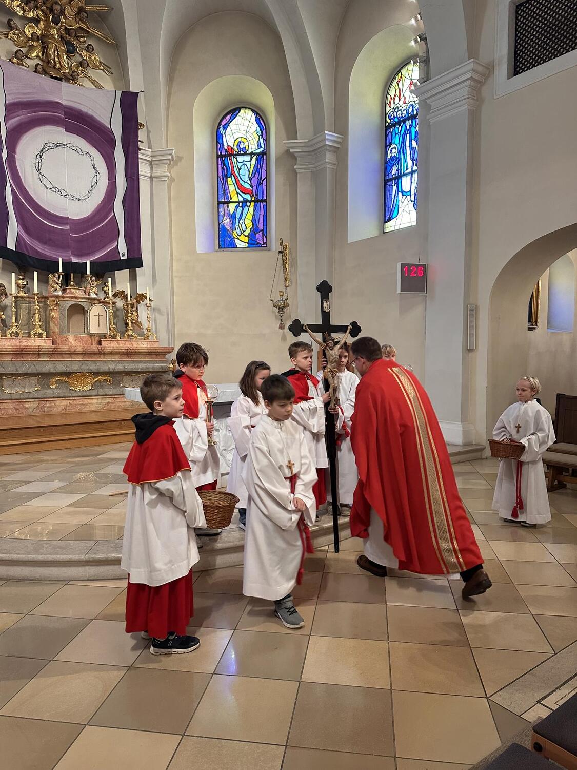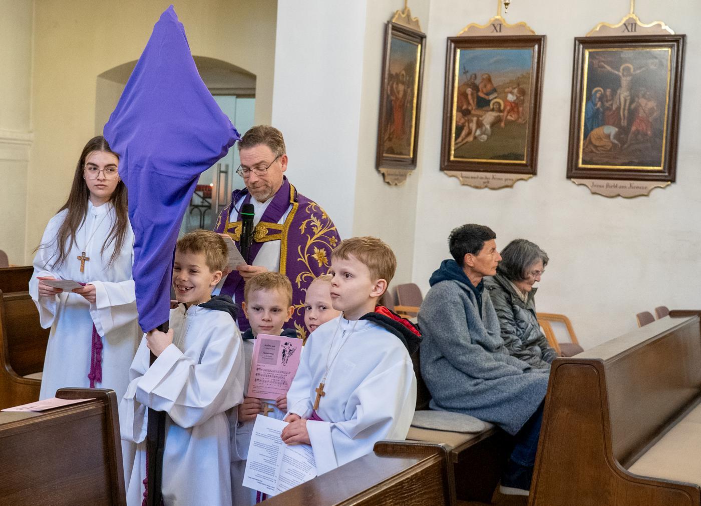 Der Karfreitag begann um 9.00 Uhr mit einer Kreuzwegandacht. Der Karfreitag ist der einzige Tag des Jahres, an dem keine Eucharistie gefeiert wird. Im Mittelpunkt der Liturgie steht die Feier vom Leiden und Sterben Christi sowie die Kreuzverehrung, weil Jesus am Kreuz für uns sein Leben hingegeben hat. Der Karfreitag ist ein strenger Fasttag.