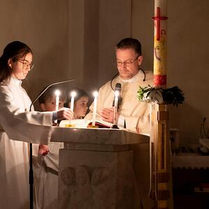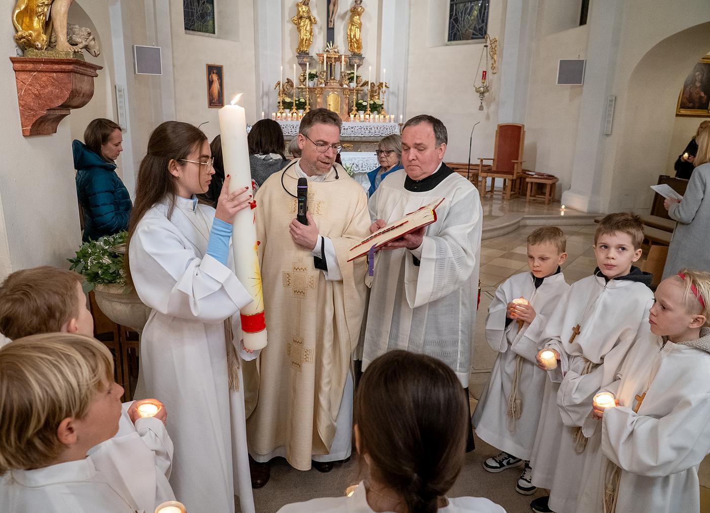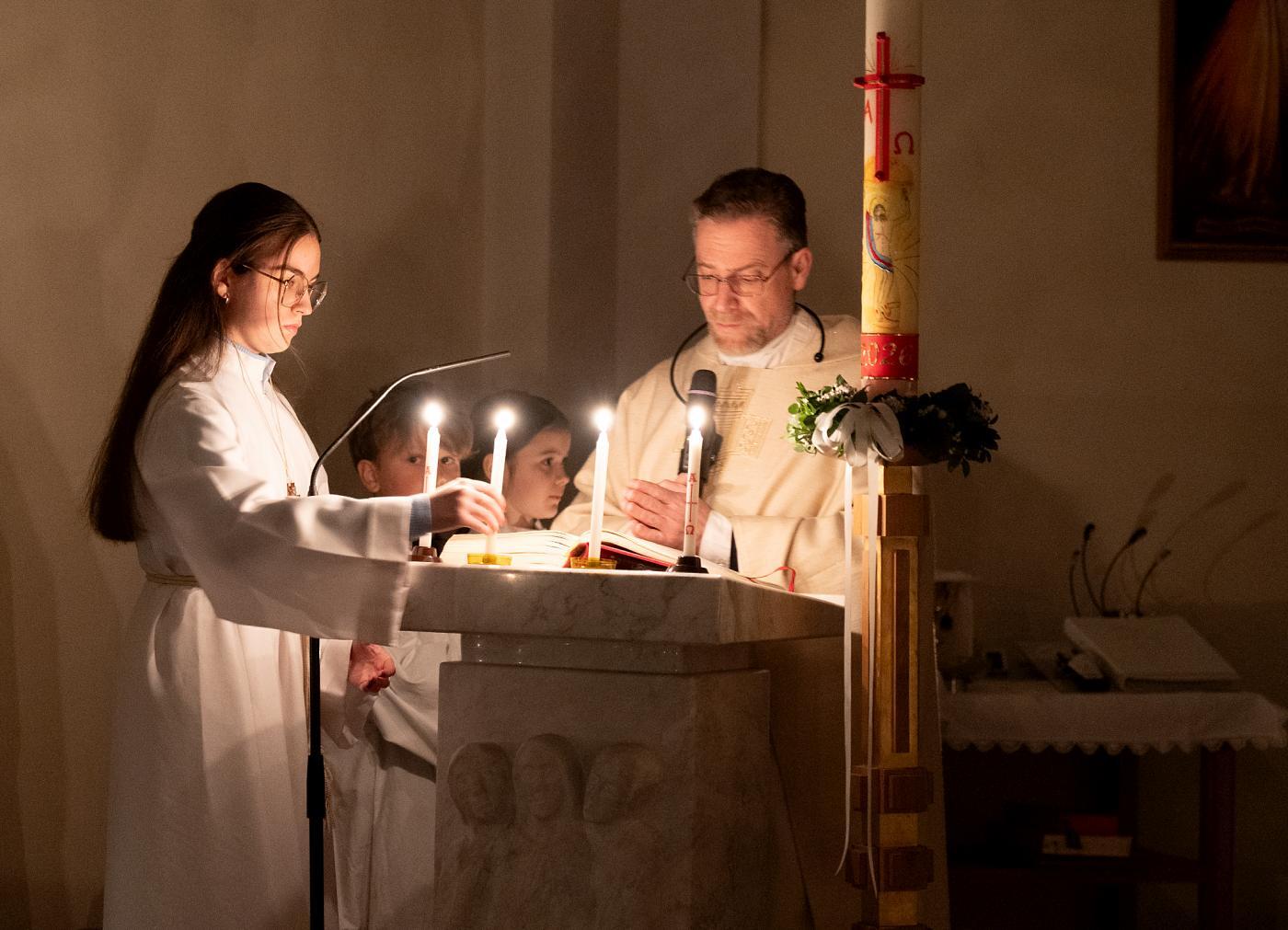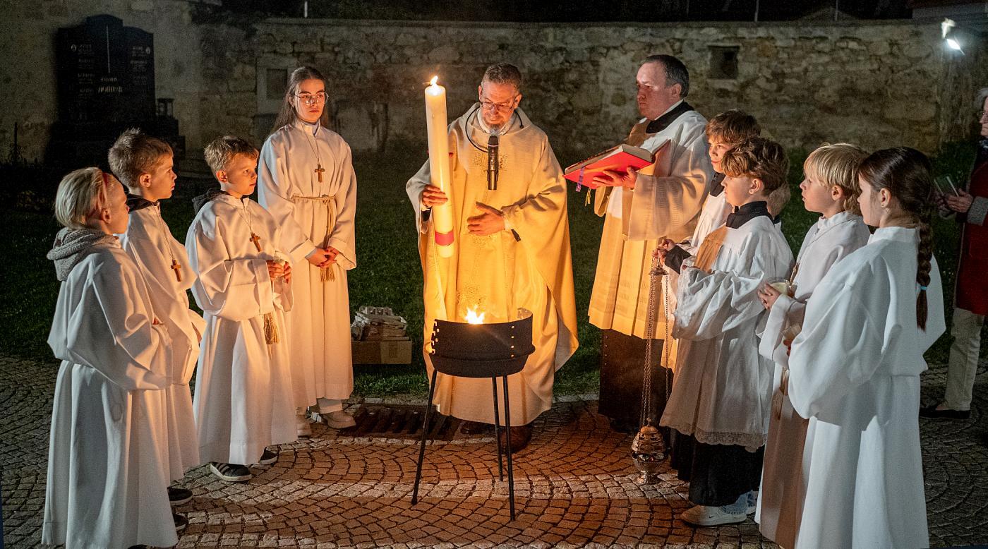 Nach Einbruch der Dunkelheit beginnt die Feier der Osternacht. Vor der Kirche wurde das Osterfeuer entzündet und gesegnet. Die brennende Osterkerze wird als einziges Licht in die unbeleuchtete Kirche getragen. Dabei wird dreimal der Ruf „Lumen Christi“ (Christus, das Licht) angestimmt, worauf die Kirchenbesucher mit „Deo gratias“ (Gott sei Dank) antworten. Nach der Lichtfeier erklingt im Wortgottesdienst nach der Fastenzeit wieder das Halleluja. Bei der Tauffeier erinnern wir uns an unsere eigene Taufe. Abgeschlossen wird die Osternacht mit der Eucharistiefeier.