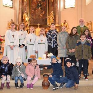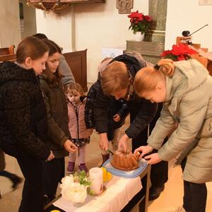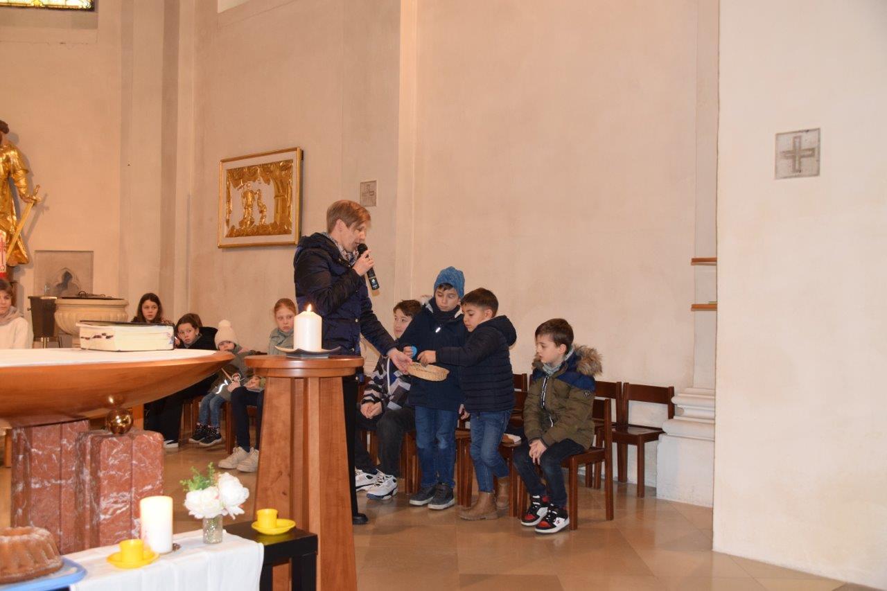 Die „Hochzeit von Kana“ war das Thema des Familiengottesdienstes am 19.1.25. Gemeinsam wurde mit Hilfe einiger Kinder ein festlicher Tisch gedeckt. Bei der Hochzeit von Kana verwandelte Jesus Wasser in Wein. Er half mit, dass dieses Fest nicht so schnell zu Ende ging. Jesus verteilte Freude unter den Menschen und half mit guten Taten. Auch im Gottesdienst verwandelten wir gemeinsam Wasser in Wein. Der Wein steht symbolisch für die Freude und die Liebe, die Jesus uns schenkt.