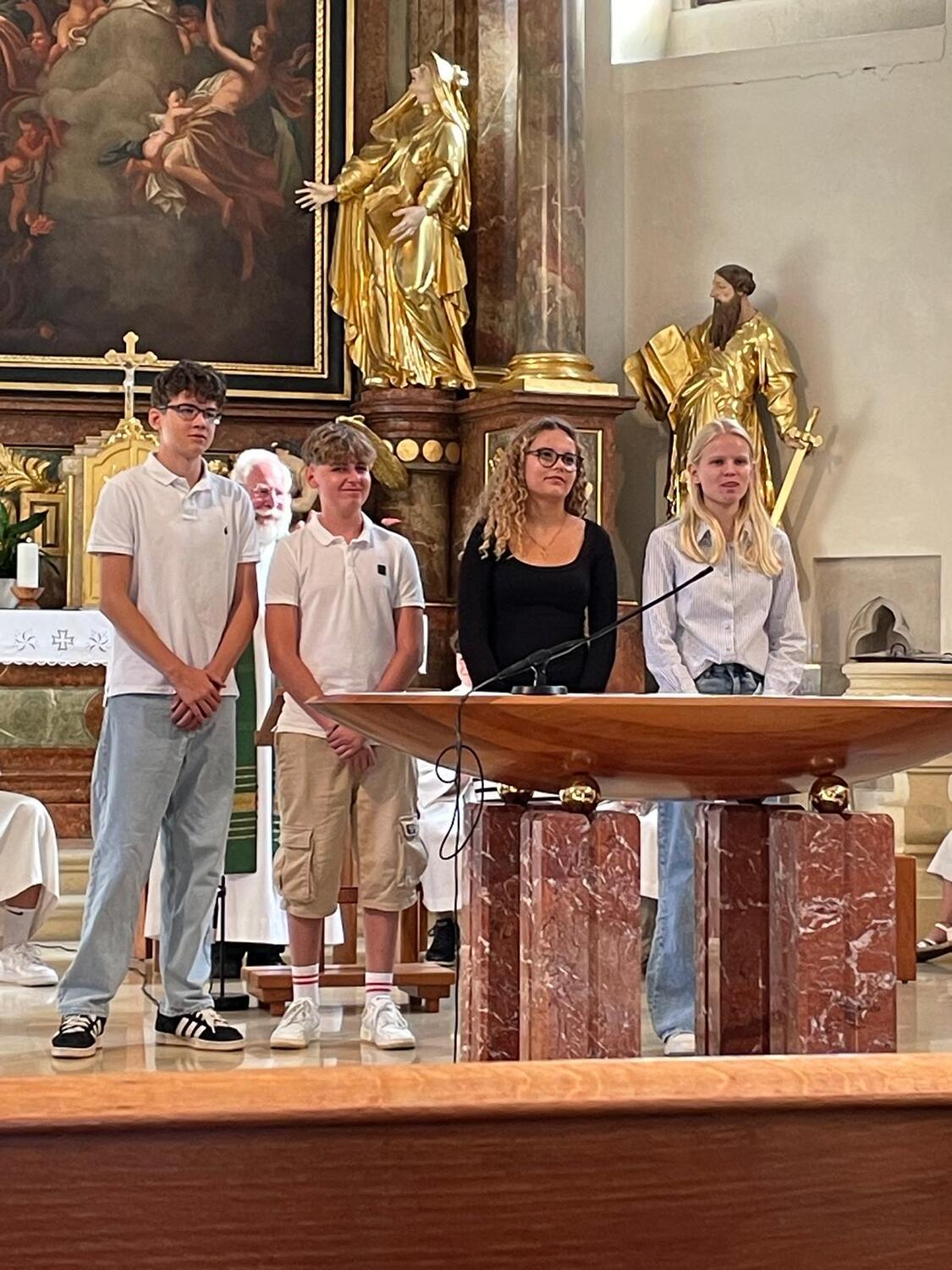 Am Sonntag, den 21. September 2025, wurden im Rahmen eines feierlichen Gottesdienstes vier langjährige und engagierte Ministranten aus ihrem Dienst verabschiedet. Mit großem Dank und herzlicher Anerkennung wurden Johanna Kornfehl, Lea Moritz, Tobias Lang und Alexander Zachs für ihren treuen Einsatz in der Ministrantengemeinschaft geehrt.