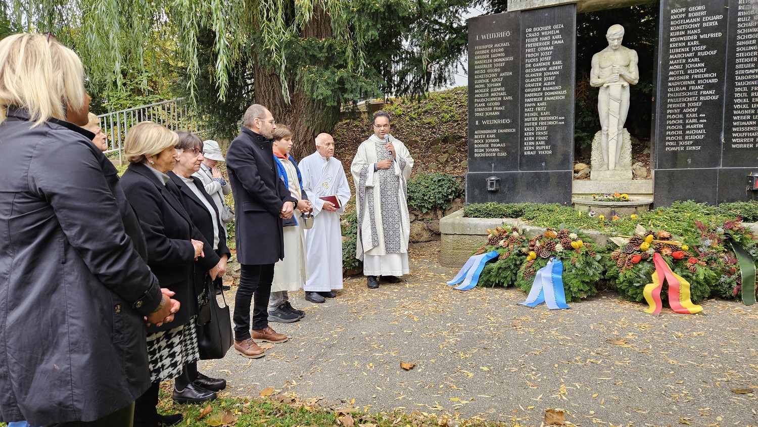 Im Anschluß an die Hl. Messe ging man gemeinsam zum Kriegerdenkmal und führte die Kranzniederlegung durch. Pater Kuruvila segnete das Kiegerdenkmal und die Gemeinde betete für die Gefallenen der beiden Weltkriege.