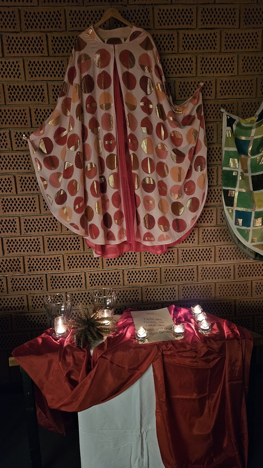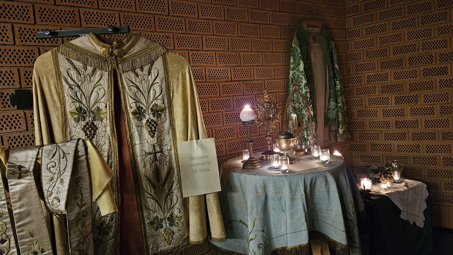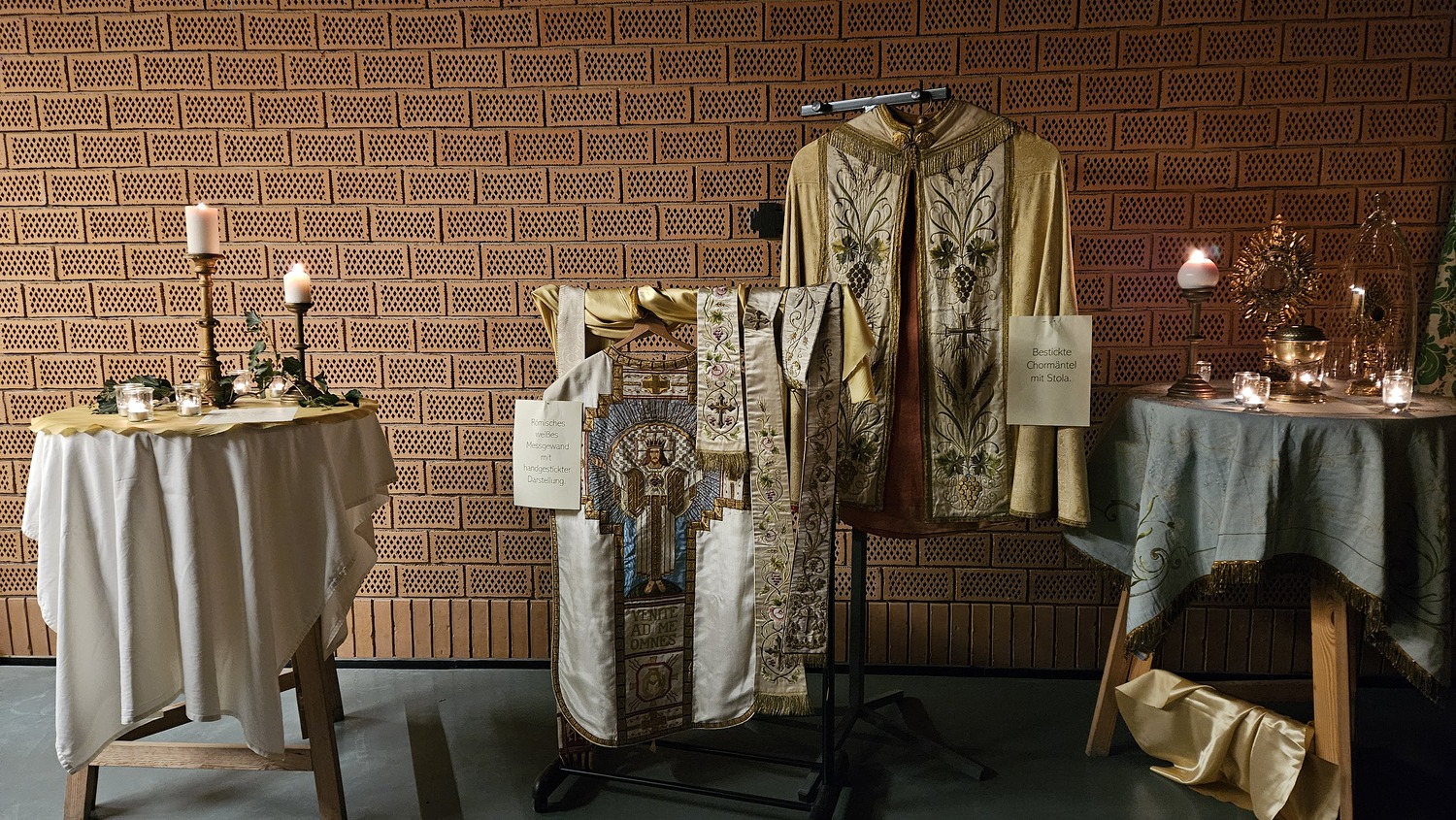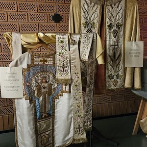 Die Besucher wurden über die Exponate mit beigefügten Texten informiert. So wurden auch unter anderem Kelche, Monstranzen, Kerzenleuchter und andere Gegenstände aus dem Fundus der alten Kirche von Bad Sauerbrunn gezeigt und auch sehr wertvolle Chormäntel und Messgewänder. Geordnet waren die Meßgewänder nach Liturgiefarben und mit beigefügten Texten, wurde die Bedeutung der Liturgiefarben erklärt.