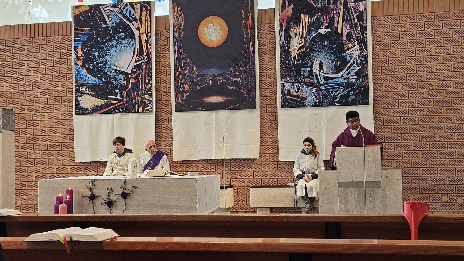 Pater Rijo, Pater Kuruvila, Pfarrkuratorin Gerti Ankerl und Diakon D. Peter Zotti