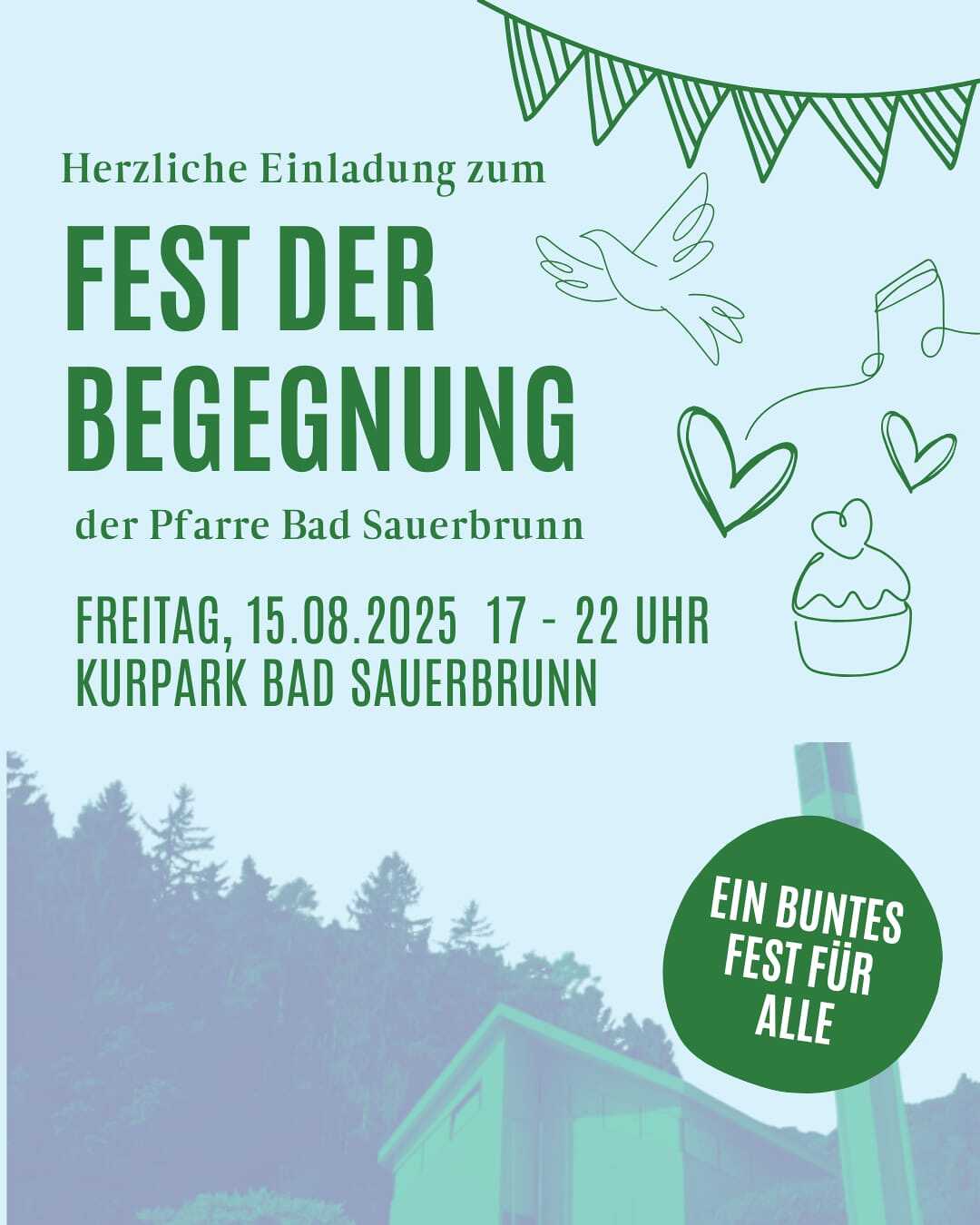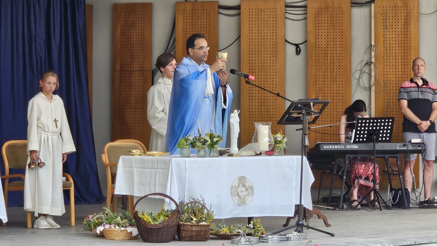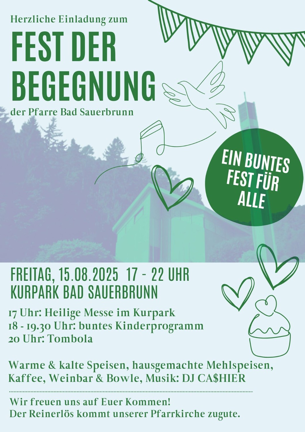 Das Patrozinium - Fest zu Ehren der Schutzpatronin der Pfarre , der Hl. Maria - feierte die Pfarre Bad Sauerbrunn am Festtag Mariä Himmelfahrt, dem 15. August 2025 mit einer Hl. Messe im Kurpark. Erstmals wurde diese Heilige Messe erst am Abend um 17 Uhr gefeiert. Pater Kuruvila zelebrierte die Hl. Messe und wies auf die besondere Bedeutung dieser Feier hin und betreffend das "Fest der Begegnung" auf die Wichtigkeit, in der Pfarre gemeinsam zu feiern. Die Hl. Messe unterstützten als Lektoren Pfarrgemeinderätin Kathi Graner und Pfarrgemeinderat Hermann Dittrich, als Ministranten Alexander Hanner und Johanna Lang. Die musikalische Unterstützung wurde durch Katja Visi-Kalmár und Sándor Kalmár wie immer ganz ausgezeichnet gestaltet. Viele Pfarrmitglieder und Gäste waren gekommen um gemeinsam die Hl. Messe zu feiern.