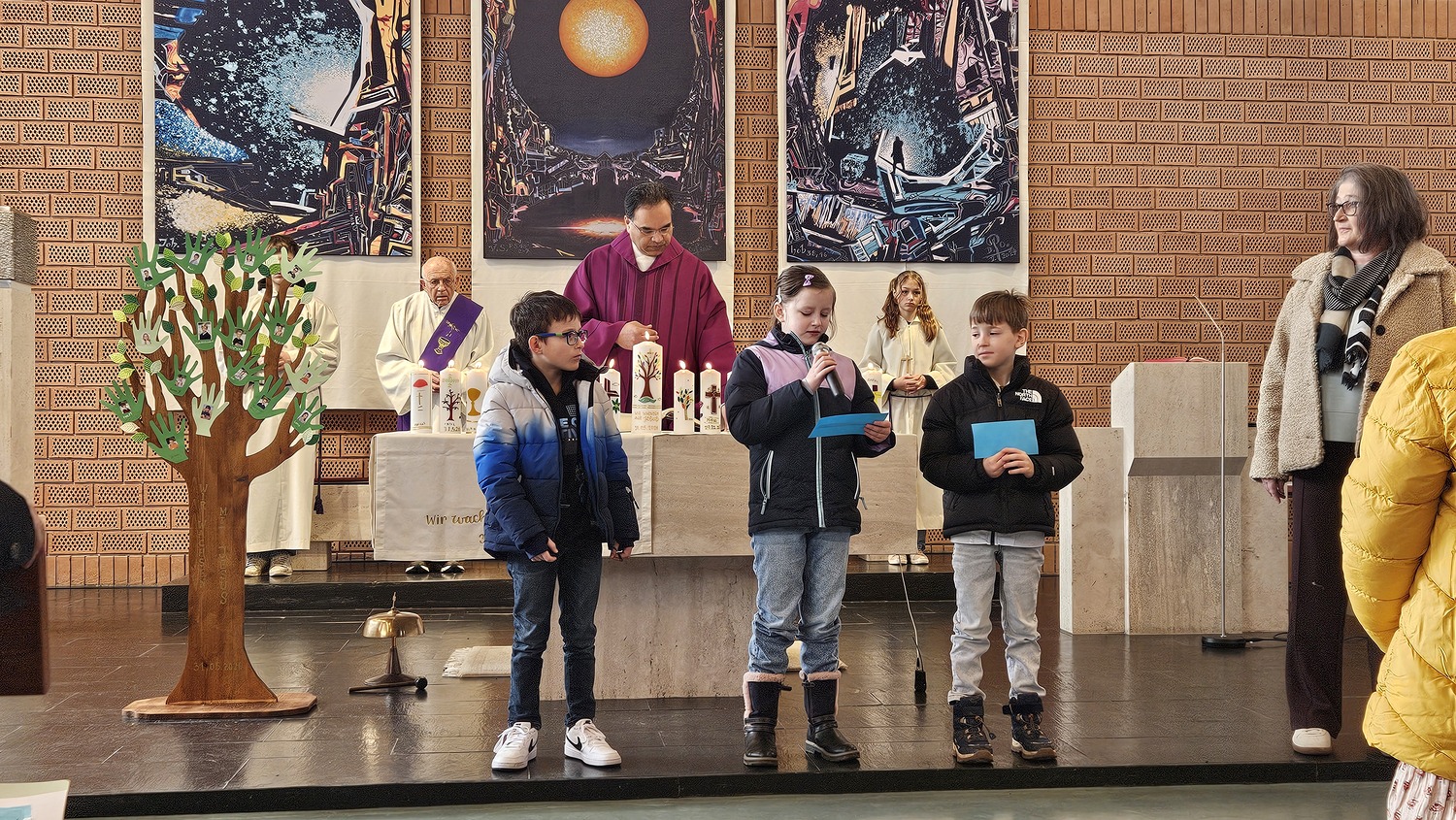 Die Erstkommunionkinder hatten auch rhytmische Lieder einstudiert, die sie mit viel Engagement sangen und sie trugen auch Texte im Gottesdienst, wie z.B. die Fürbitten vor. Die Vorstellung der Kinder war geglückt, denn man konnte die Verbindung zwischen Messbesuchern und den Erstkommunionkinder spüren. So war es nur logisch, dass die Messebesucher die Vorstellung und die Leistungen der Kinder mit Applaus honorierten.