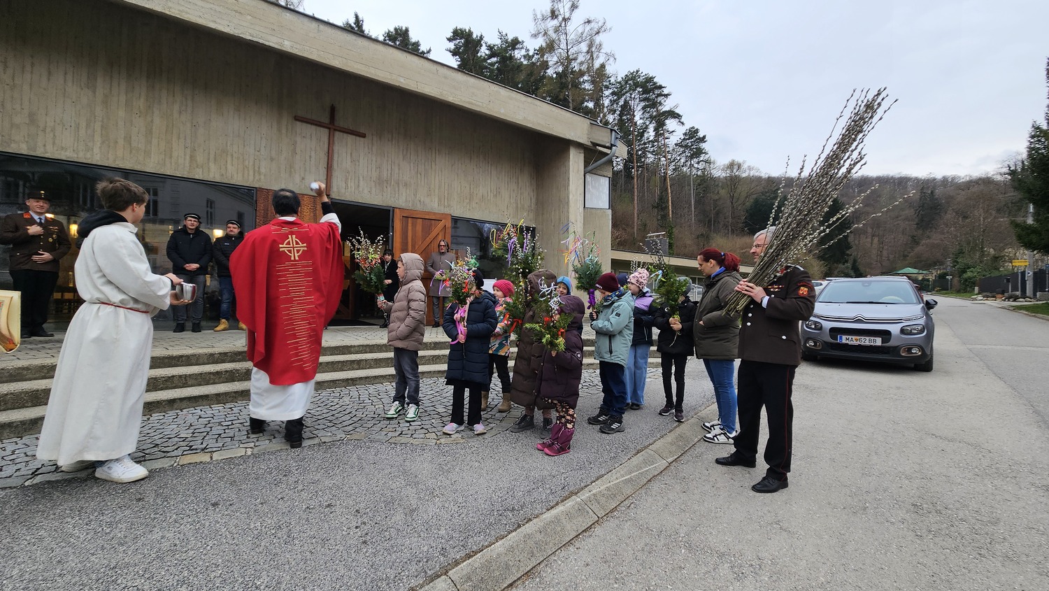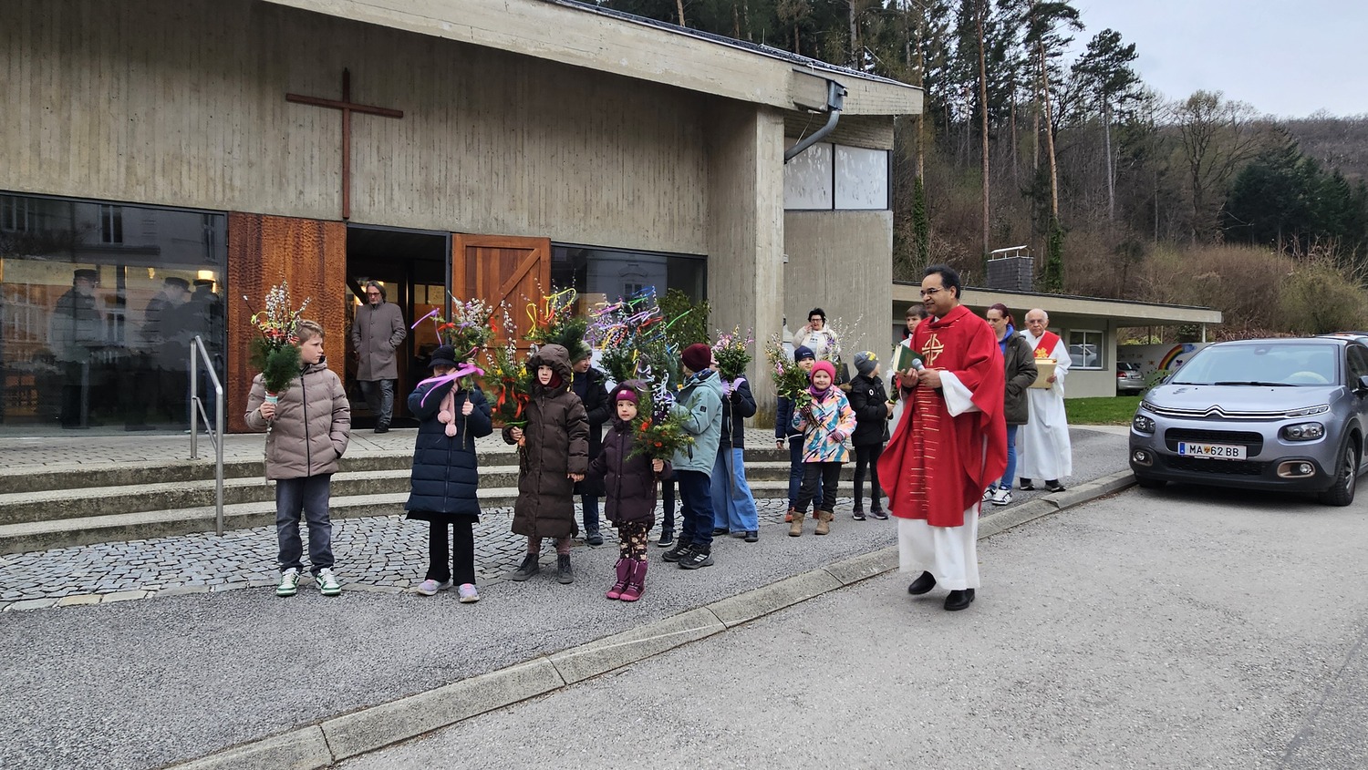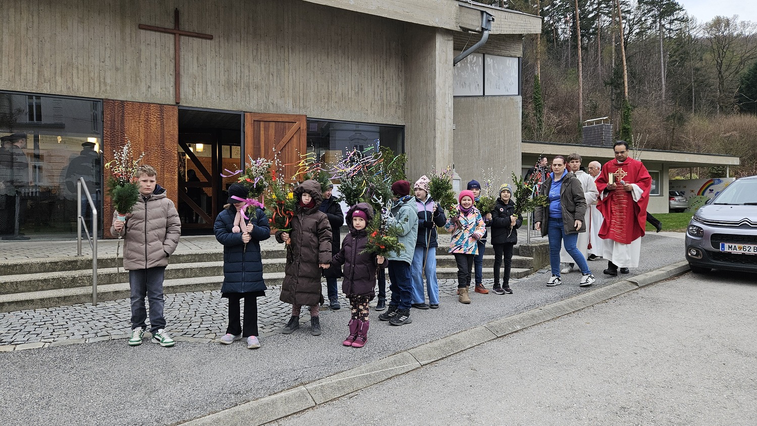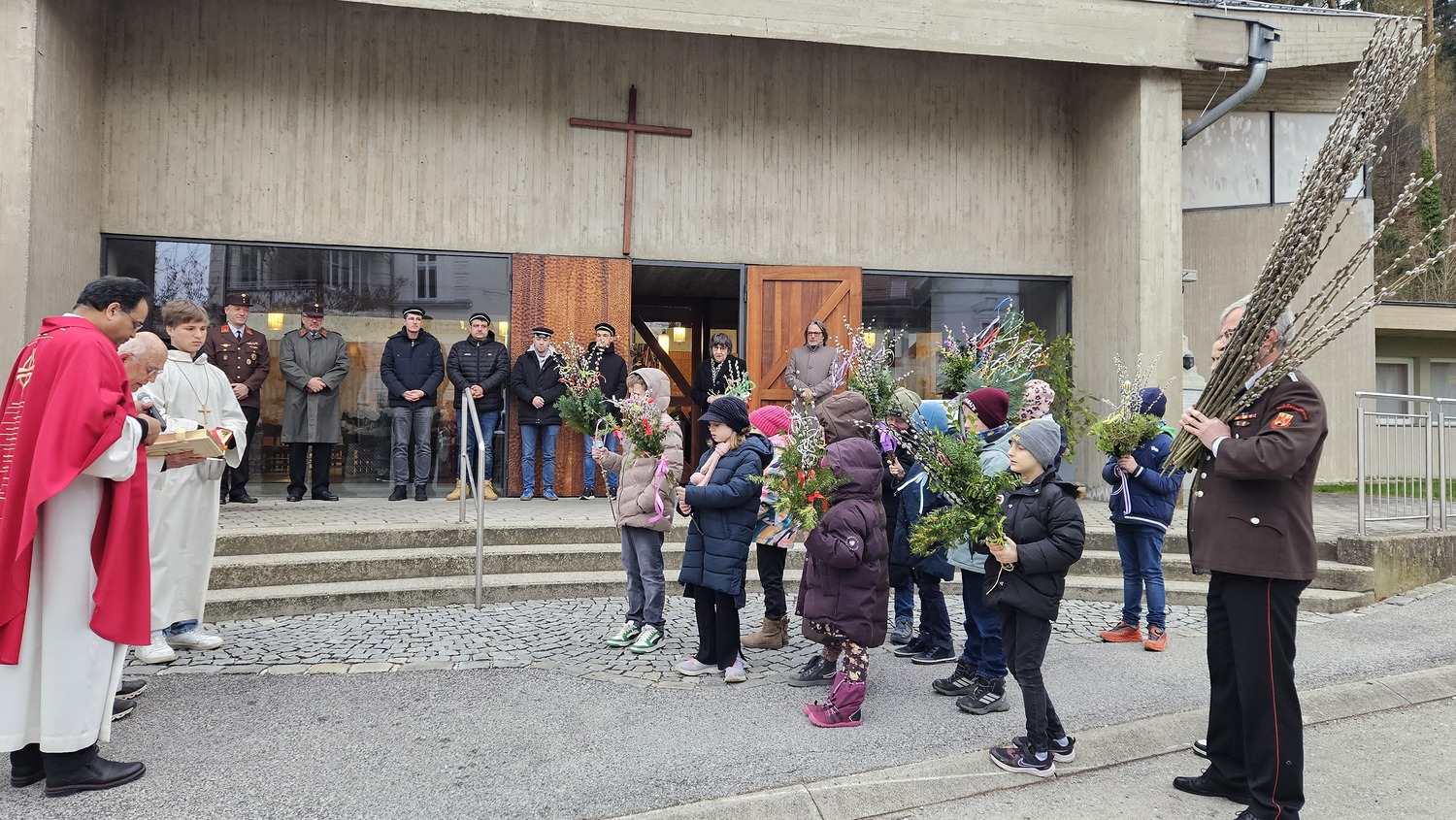 Den Einzug Jesu in Jerusalem feierte die Pfarre Bad Sauerbrunn am Sonntag, dem 29. März 2026 0830 Uhr mit Palmbuschen und Palmzweigen. Auf Grund der eher herausfordernden Wetterbedingungen, wurde die Palmprozession abgesagt. Auch die Leidensgeschichte unseres Herrn Jesus Christus wurde vorgetragen.