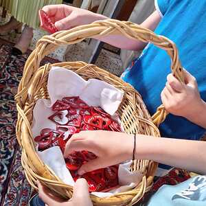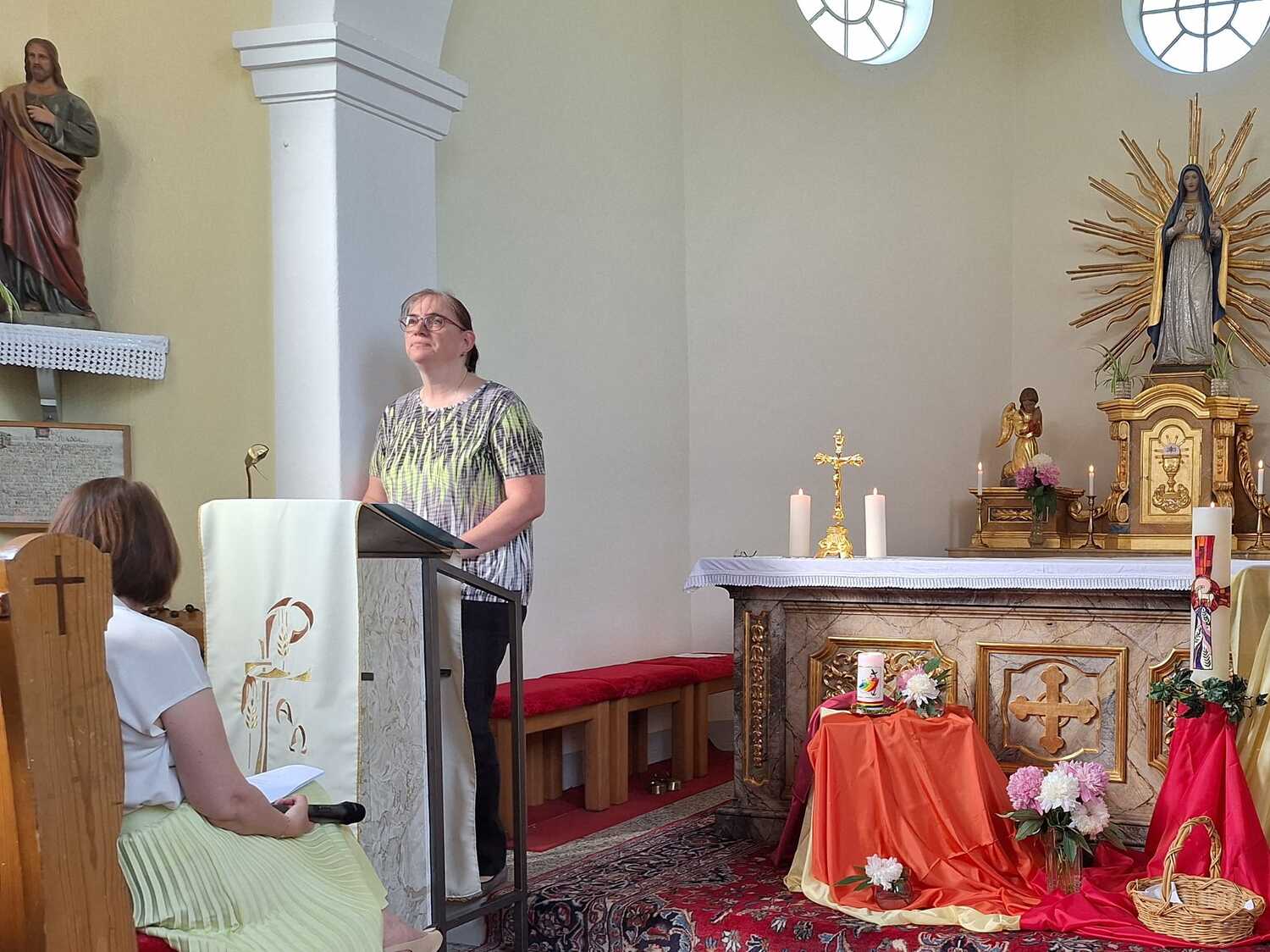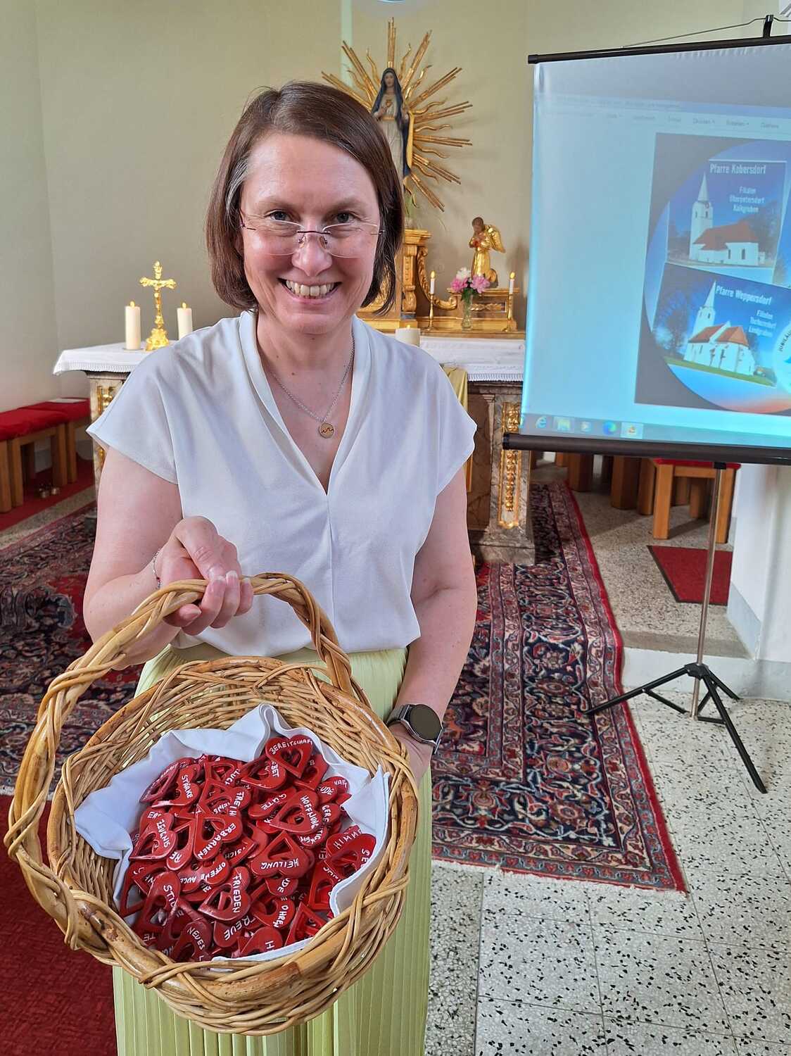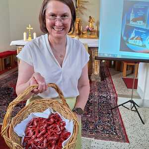 Als Zeichen der Verbundenheit mit der pfingstlichen Geistsendung und den Auftrag in der Welt zu wirken, wurden Herzen mit Attribute des hl. Geistes ausgeteilt.