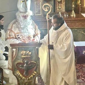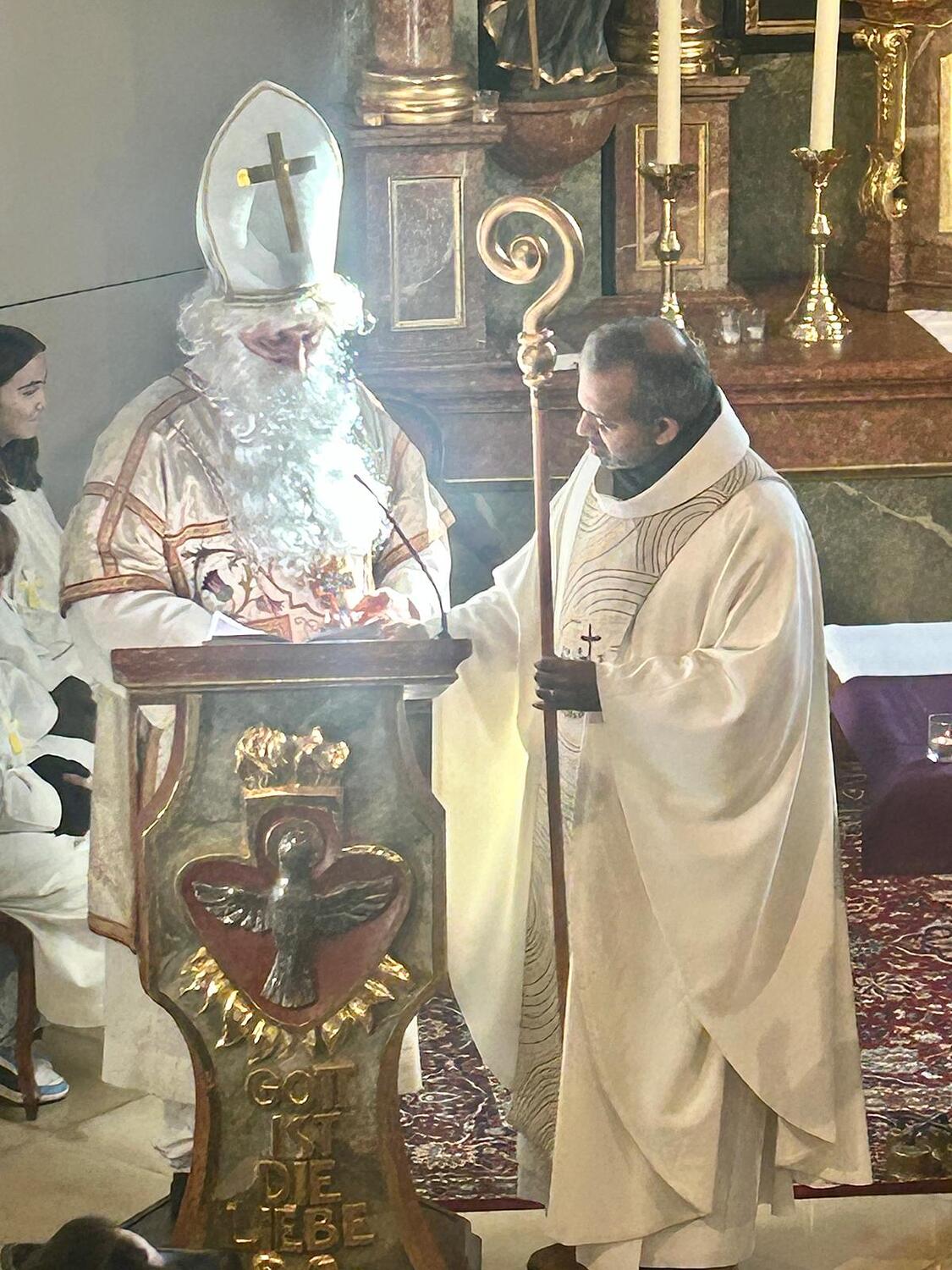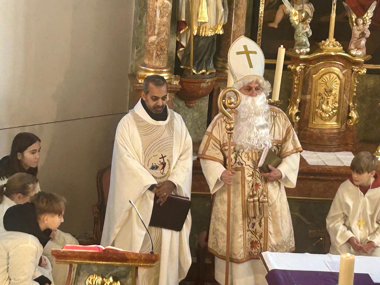 Feierlich wurde der Nikolaus von Pfarrer Shinto begrüßt. In einer kindgerechten Gesprächsrunde stellte der Pfarrer dem Nikolaus viele Fragen, die dieser den zahlreichen anwesenden Kindern verständlich und anschaulich beantwortete. Gemeinsam erklärten sie die Bedeutung der Mitra, des weißen Gewandes, des Bischofsstabes, des Ringes und des Kreuzes – Symbole, die an das Wirken und die Güte des hl. Nikolaus erinnern.