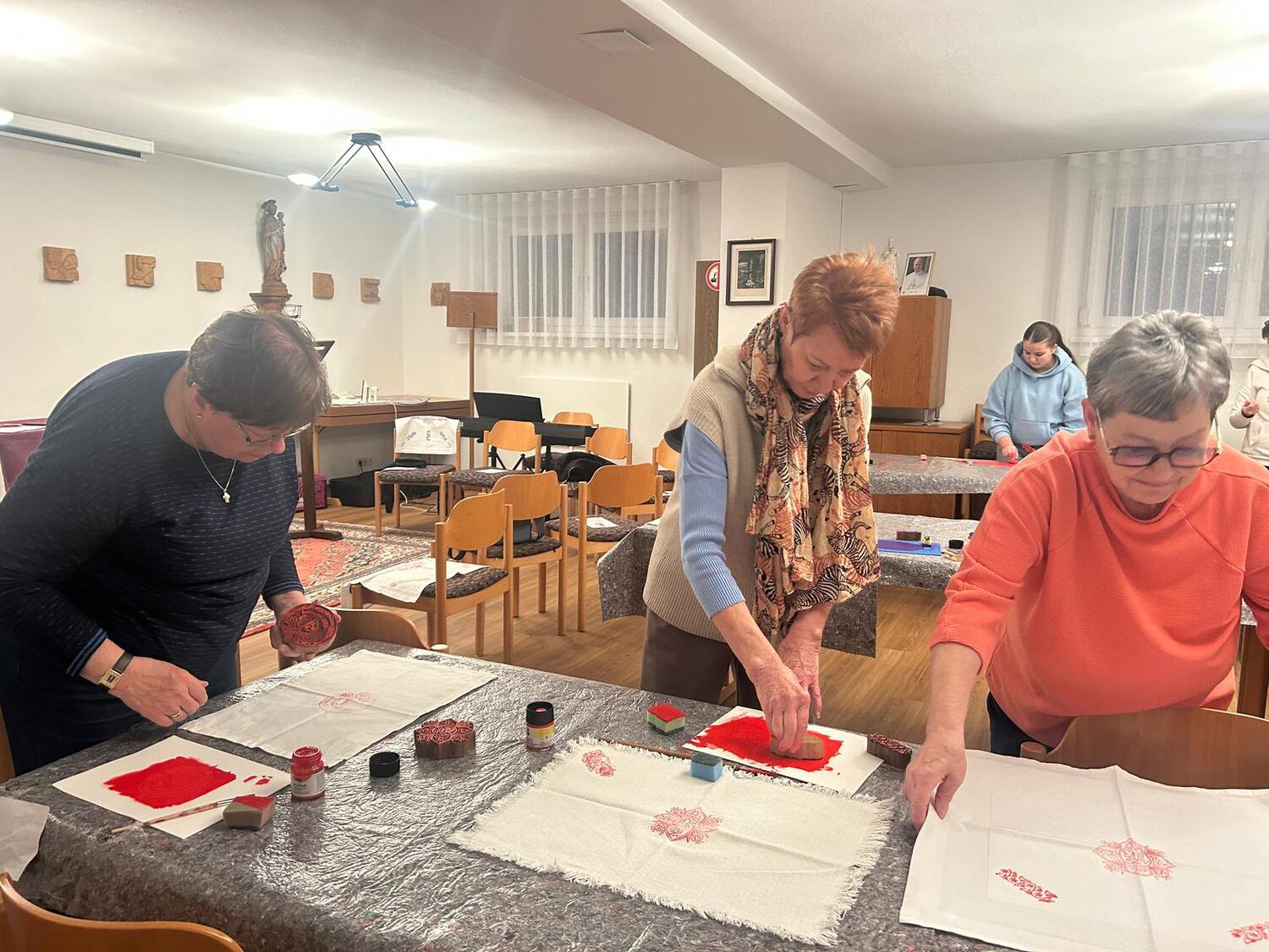 Am vergangenen Donnerstag, dem 26. März, verwandelte sich unser Pfarrheim in eine kreative Werkstatt. Unter der fachkundigen und inspirierenden Leitung von Frau Christa Fraunschiel - einer vielseitig engagierten Dame aus unserer Filiale Kalkgruben - tauchten zahlreiche Teilnehmerinnen in die faszinierende Welt des Stoff-Handdrucks ein.
