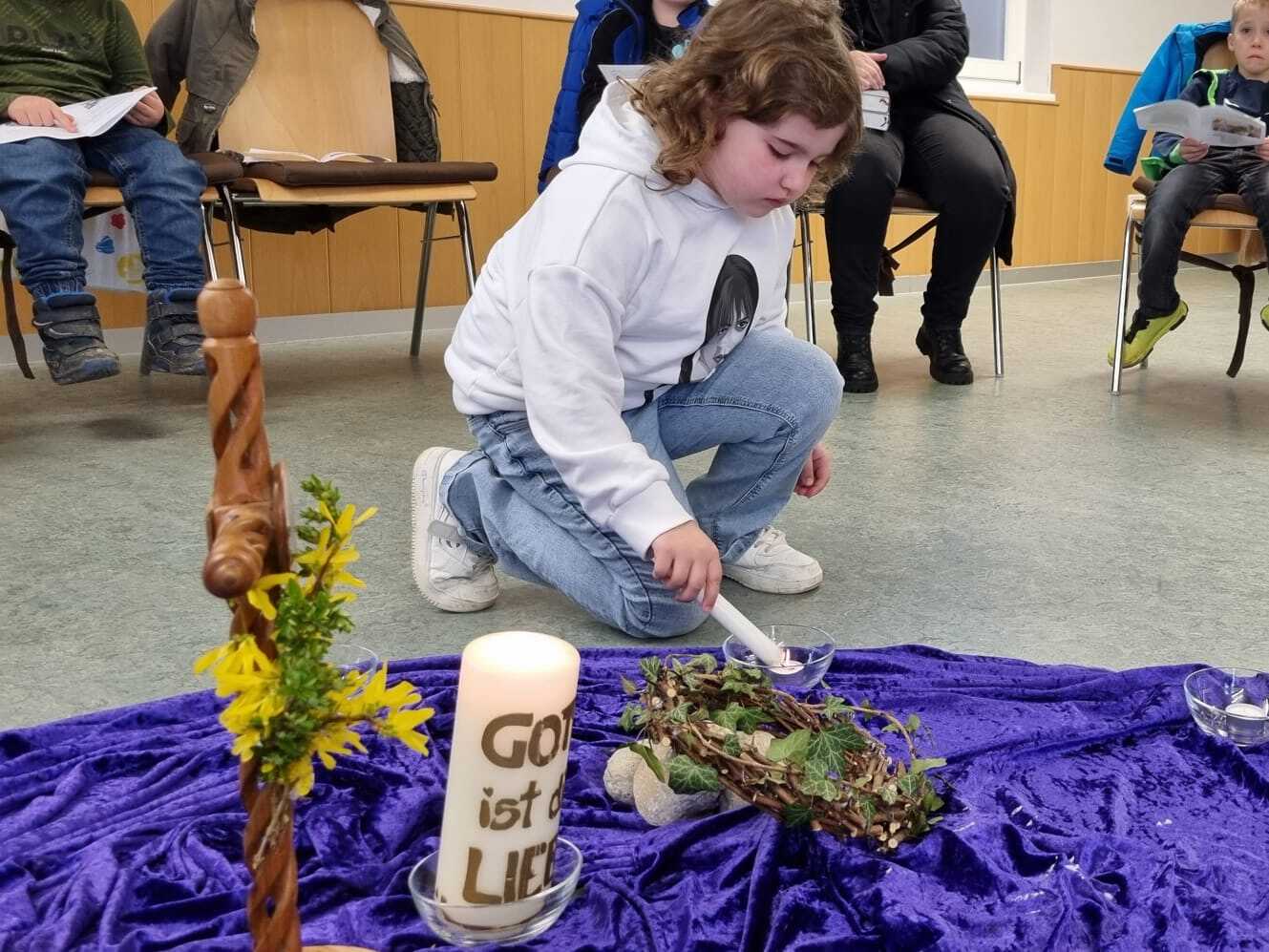In 6 Stationen wurden den Kindern die letzten Stunden Jesu nahe gebracht. Dabei ist ihnen deutlich geworden, dass Leid und Grausamkeit nicht das letzte ist, sondern der Kreuzweg mit der Auferstehung endet. Jede der Stationen beinhaltete eine Fürbitte, dazu wurde von den Kindern eine Kerze entzündet.
