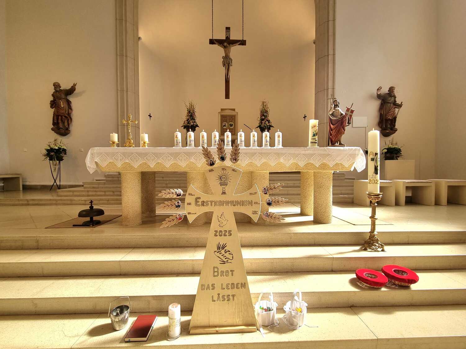 Am Samstag den 03.05.2025 um 10 Uhr war es dann soweit, der große Tag war gekommen und in Begleitung von Familie, Freunden und der Jugendmusik zogen die Kinder mit ihren Taufpaten und Taufpattinnen in die Kirche ein. Wie immer war diese besonders schön geschmückt, ein wunderschönes Holzkreuz mit Namen der Erstkommunionkinder zierte den Altar.