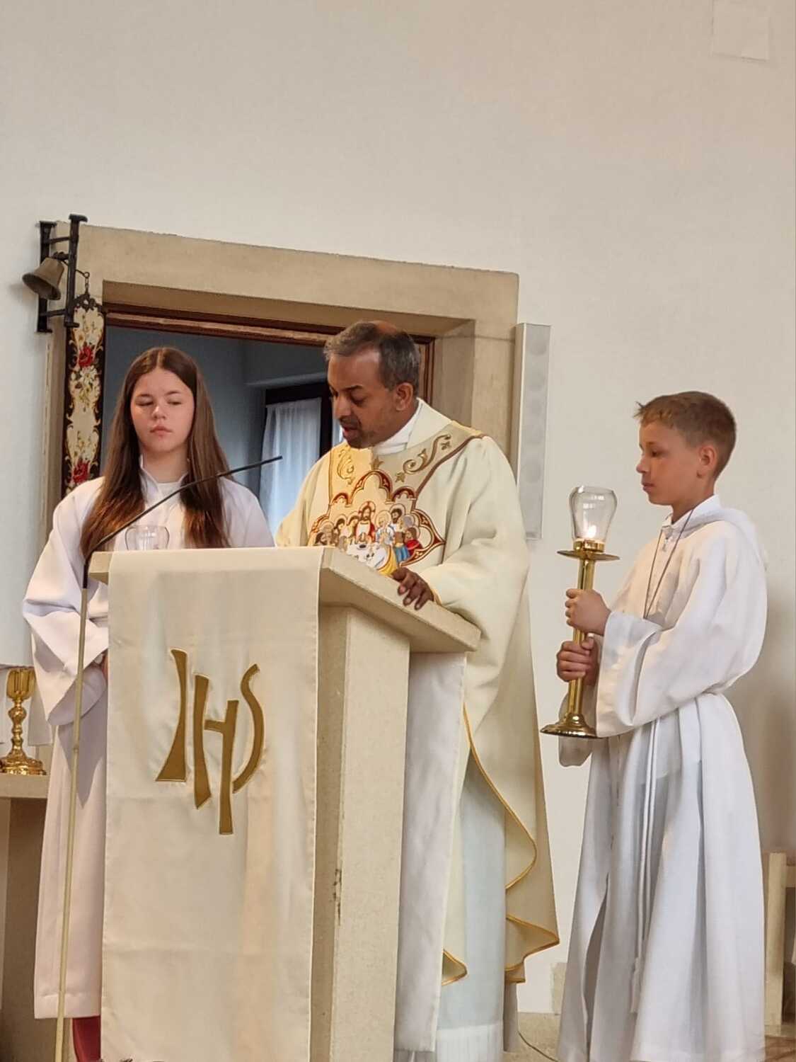 Gemeinsam mit ihren Müttern bereiteten sie sich voller Freude auf den großen Tag vor. Es wurden Palmbuschen gebunden, Brote gebacken und Kerzen gebastelt. Im Religionsunterricht erklärte ihnen Religionslehrerin Adele Grill die liturgischen Themen wie z.B. die Taufe, die Eucharistiefeier, die Beichte und die Nähe zu Gott. So oft es ging war unser lieber Herr Pfarrer Mag. Shinto Varghese Michael bei den Vorbereitungsstunden dabei, was für die Kinder ein besonderes Highlight war.
