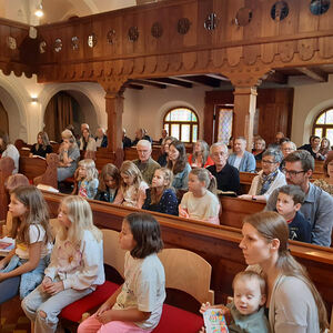 Danach zogen die Kinder in die alte Schule, wo ein abwechslungsreiches Kinderprogramm von Katja Schützenhofer und ihrem Team vorbereitet war. Während die Kinder dem Erzähltheater zum Thema „Ich mache euch zu Menschenfischern“ lauschten und danach bei einer Kreativstation Fische basteln konnten, führte David Piniel die Erwachsenen durch die Kirchen- und Glockengeschichte der Bekenntniskirche Weppersdorf. Zwischen den einzelnen Vortragsblöcken wurde gemeinsam gesungen und wer wollte, konnte die VaterUnser-Glocke besichtigen. Außerdem bestand die Möglichkeit einen Film zur Geschichte der Bekenntniskirche von Weppersdorf zu schauen.