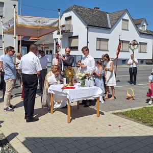 Im Anschluss an die Messe zog die Gemeinde in einer feierlichen Prozession mit dem Allerheiligsten durch die Straßen unseres Ortes. Der Weg führte zu vier festlich geschmückten Altären, die von engagierten Gemeindemitgliedern liebevoll vorbereitet worden waren. An jedem Altar wurde das Evangelium verkündet, Fürbitten gehalten und der sakramentale Segen gespendet.