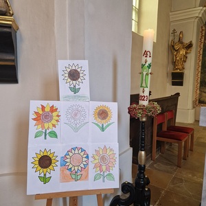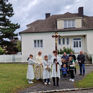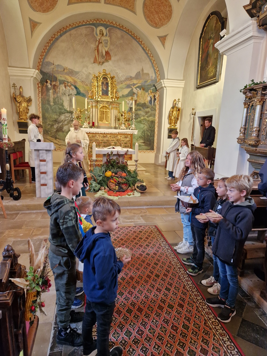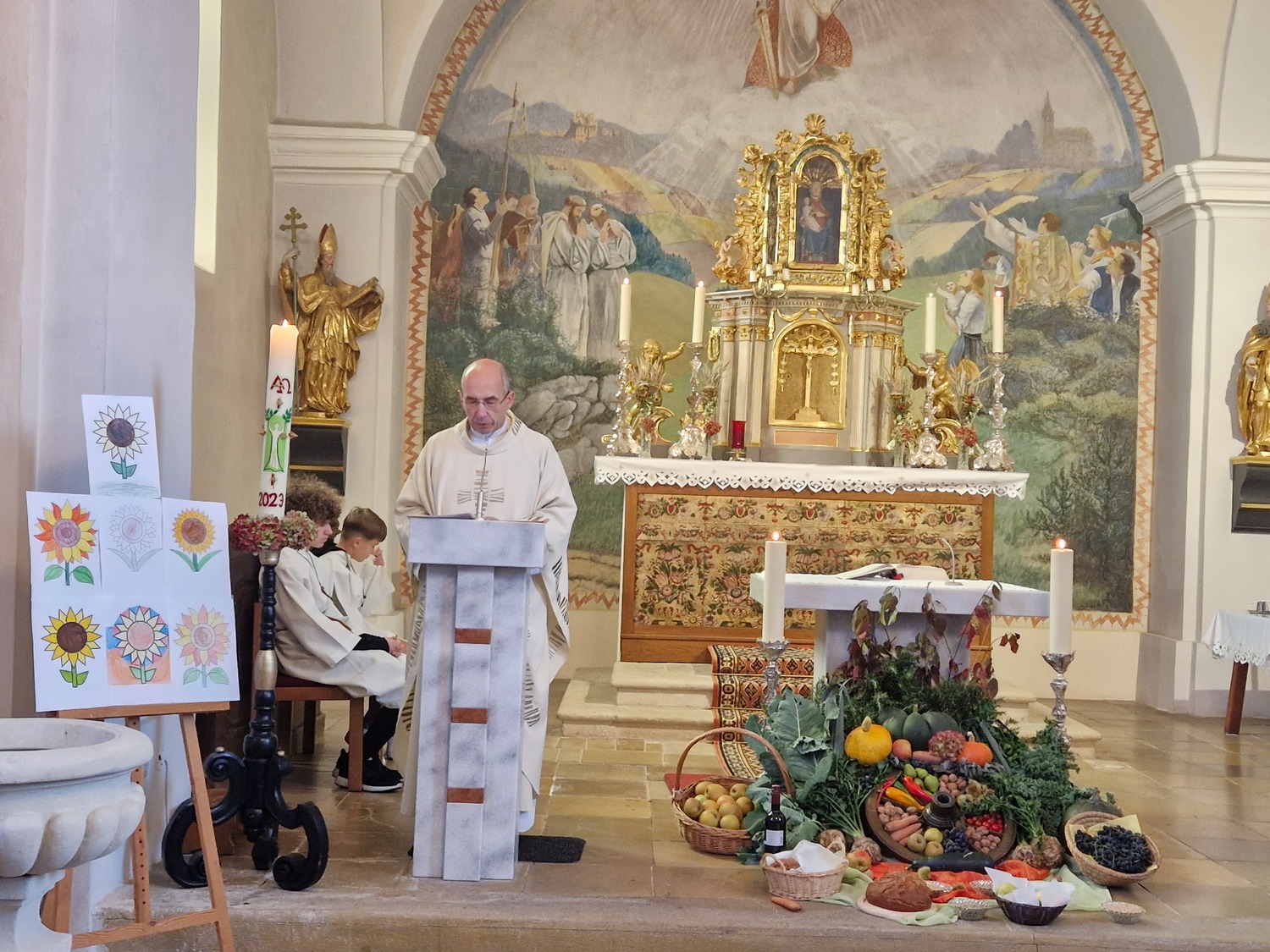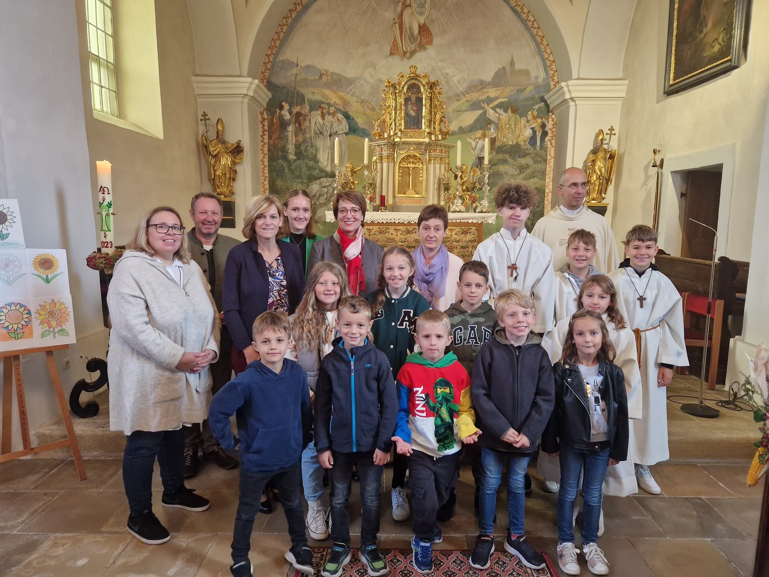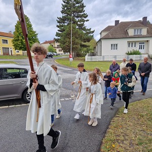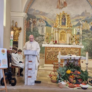 Aus Dankbarkeit feierten wir wieder das Erntedankfest. Pfarrer Gregor erzählte von den Sonnenblumen. Die Kinder und Sänger/innen gestalteten die Eucharistiefeier mit. Anschließend fand die Agape diesmal bei kühlem Wetter im Pfarrhof statt.