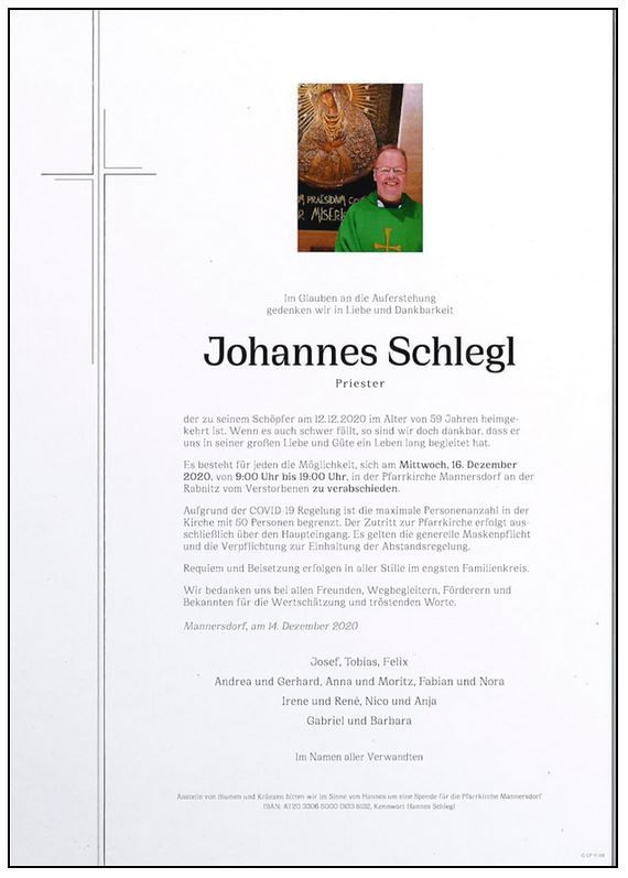 Anstelle von Blumen und Kränzen bitten wir im Sinne von Hannes um eine Spende für die Pfarrkirche Mannersdorf a. d. R. - IBAN: AT20 3306 5000 0133 5132, Kennwort Hannes Schlegl