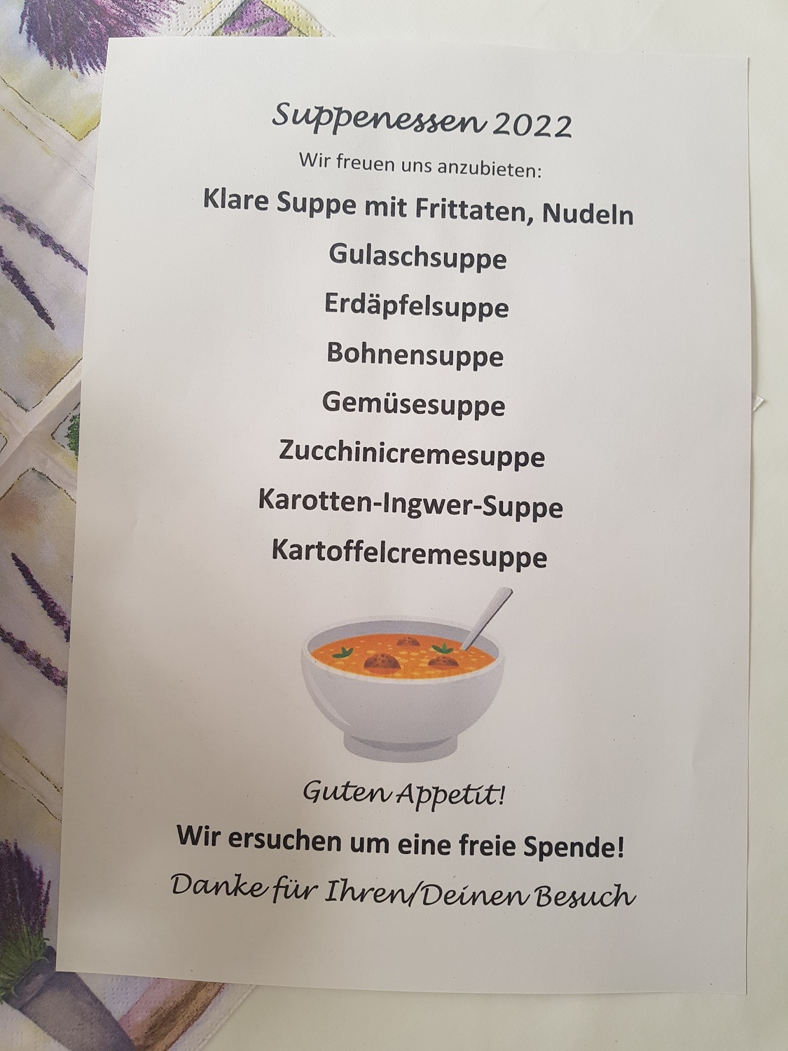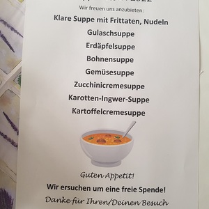 Die Katholische Frauenbewegung Landsee veranstaltete anlässlich des Familienfasttages das Suppen-Essen im Pfarrhof. "Teilen spendet Zukunft" - wir bedanken uns für Ihre Spende, die einerseits Frauenprojekten in Entwicklungsländern zu Gute kommt und die Instandhaltung unseres Pfarrhofes unterstützt.
