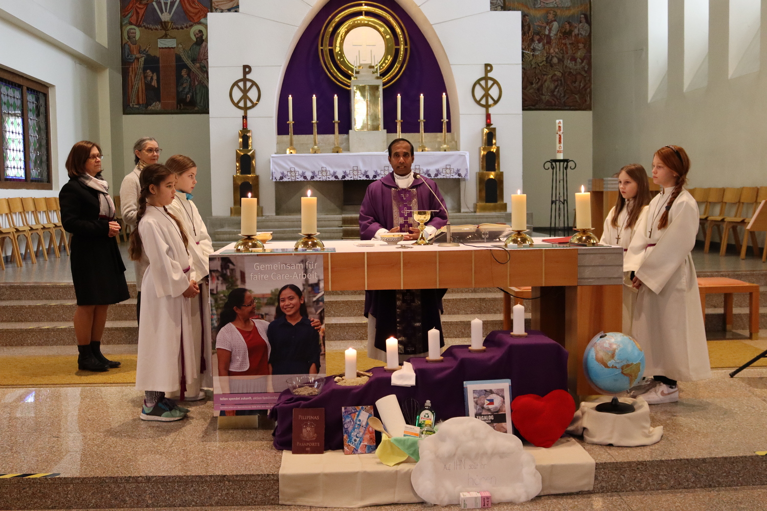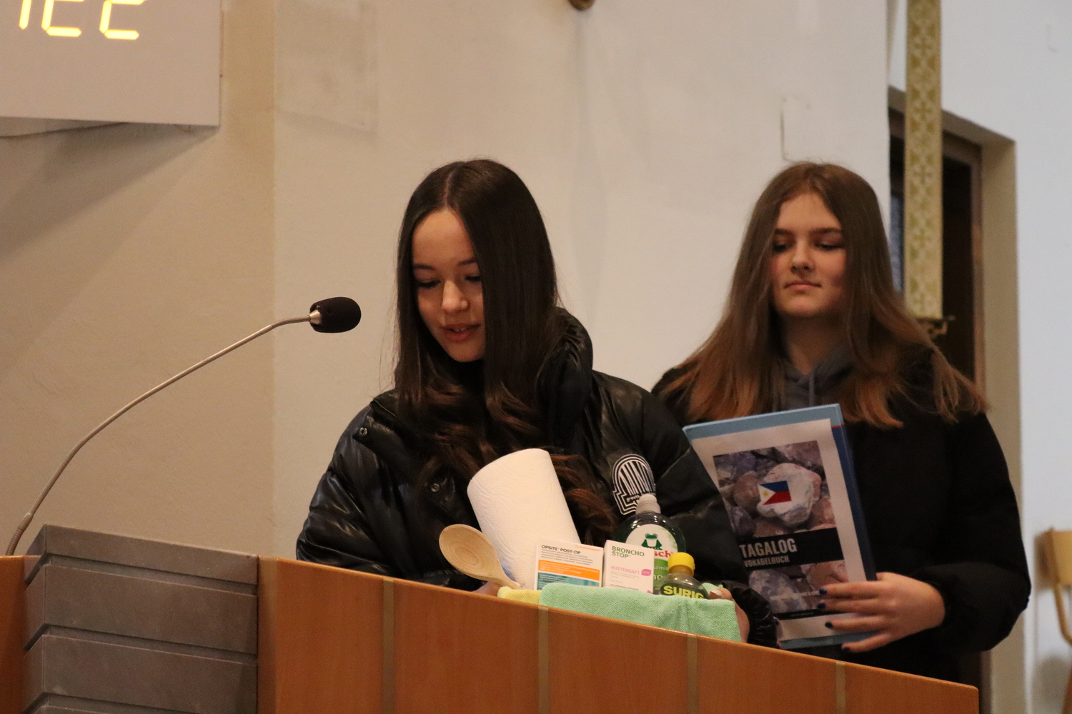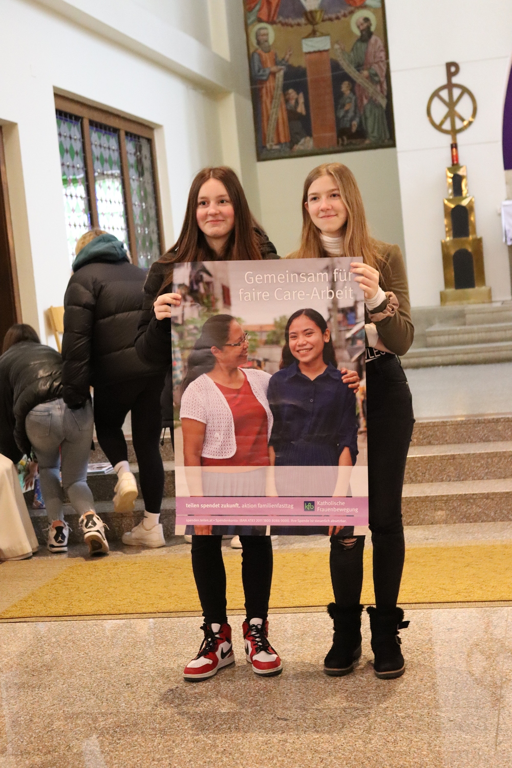 "Gemeinsam für faire Care-Arbeit" war der Slogan des heurigen Fastensuppenessens zugunsten der Aktion Familienfasttag der Kath. Frauenbewegung. Im Zentrum des Gottesdienstes standen philippinische Arbeitsmigrant:innen und ihre Familien, die als Sorgearbeiter:innen (z.B. als Haushaltshilfen, Pflegekräfte, Kindermädchen oder Krankenschwestern) im Ausland arbeiten. Mithilfe von Symbolen und Texten machten die Firmlinge auf die schwierige Situation besonders der Frauen und zurückgelassenen Kinder aufmerksam und gaben Impulse zum gemeinsamen Gebet.