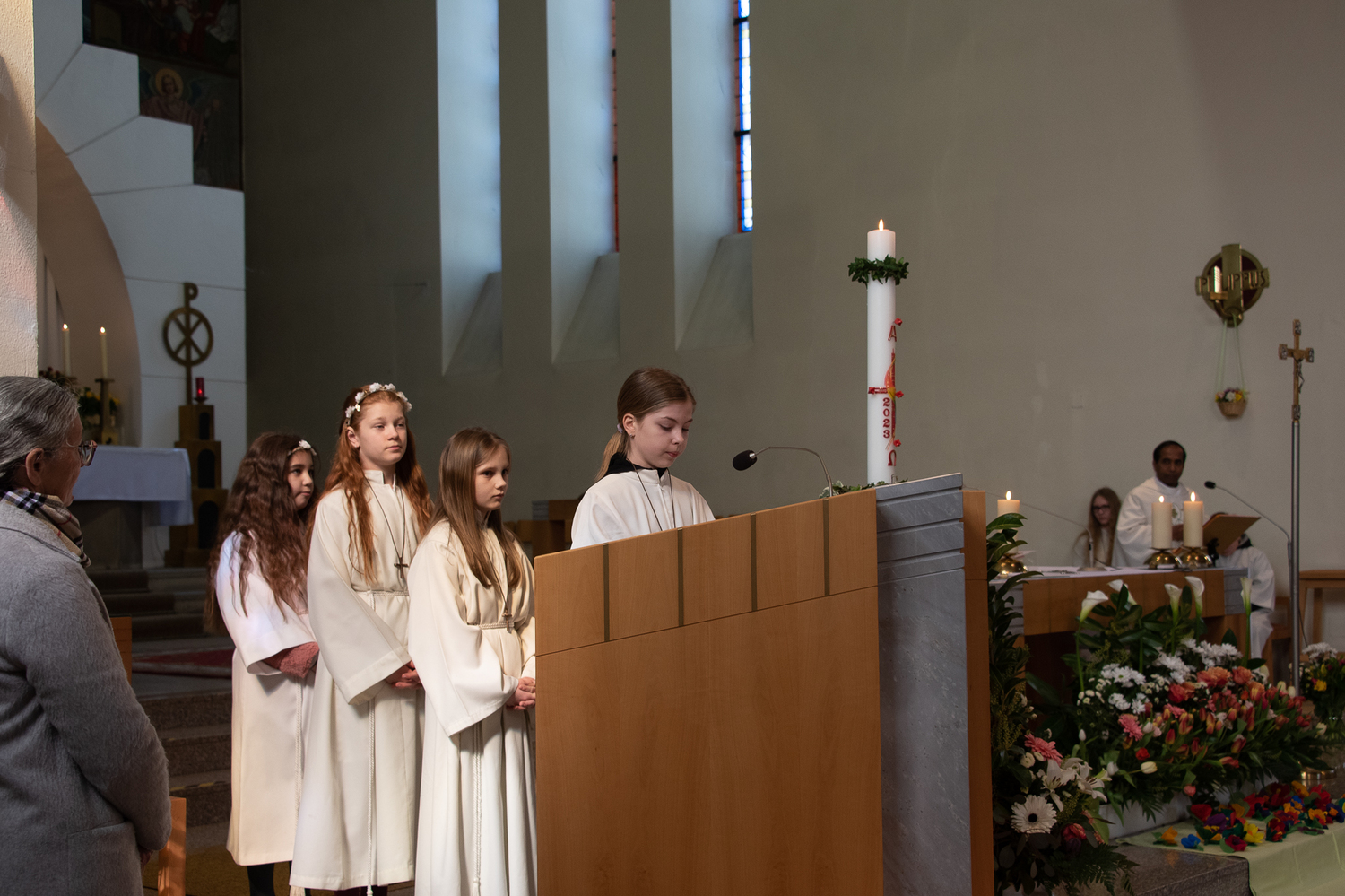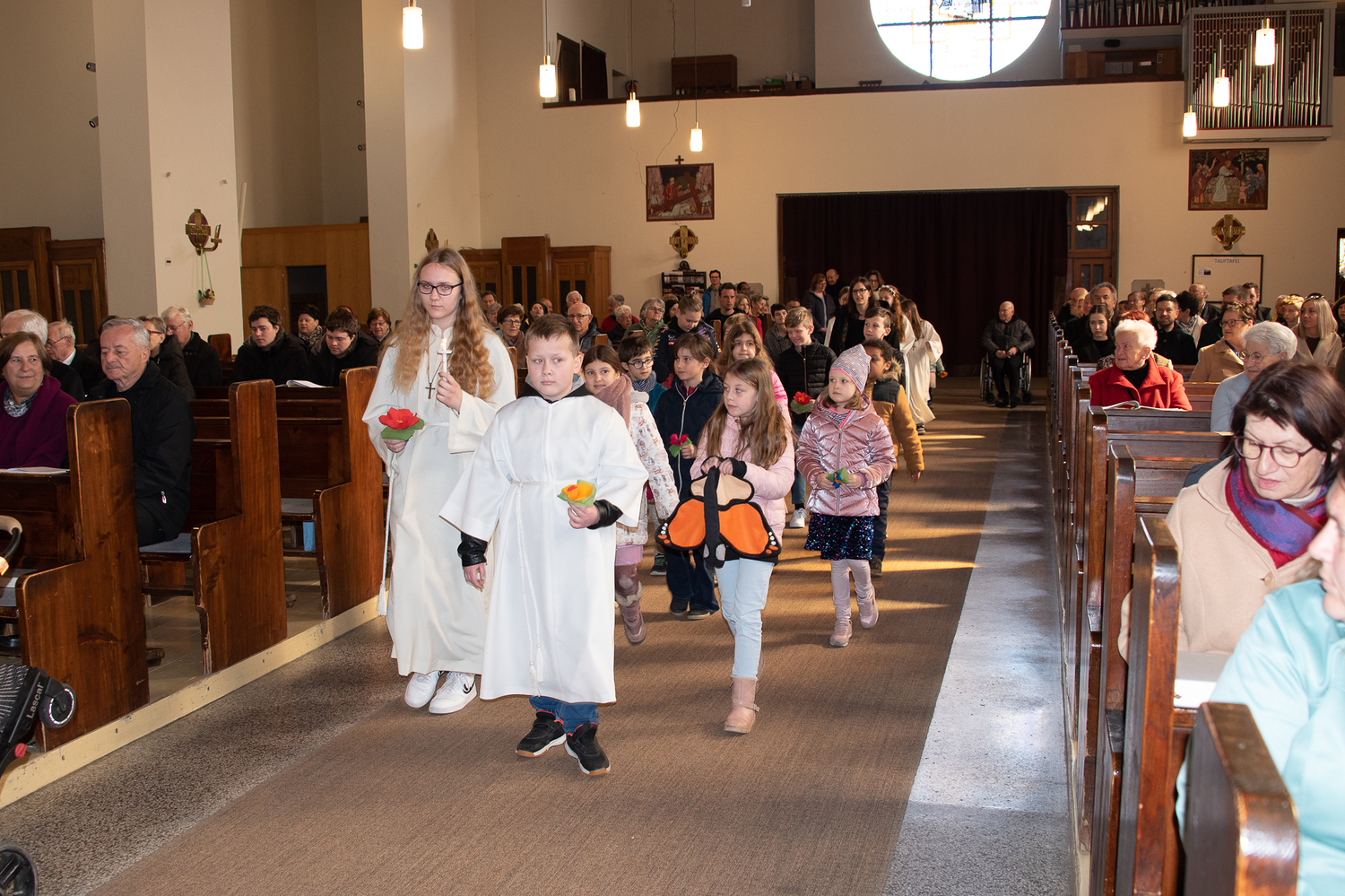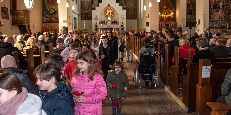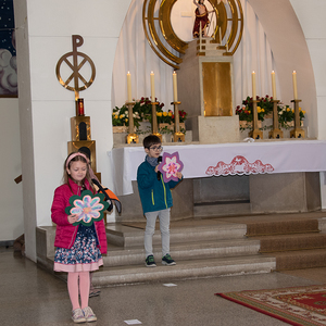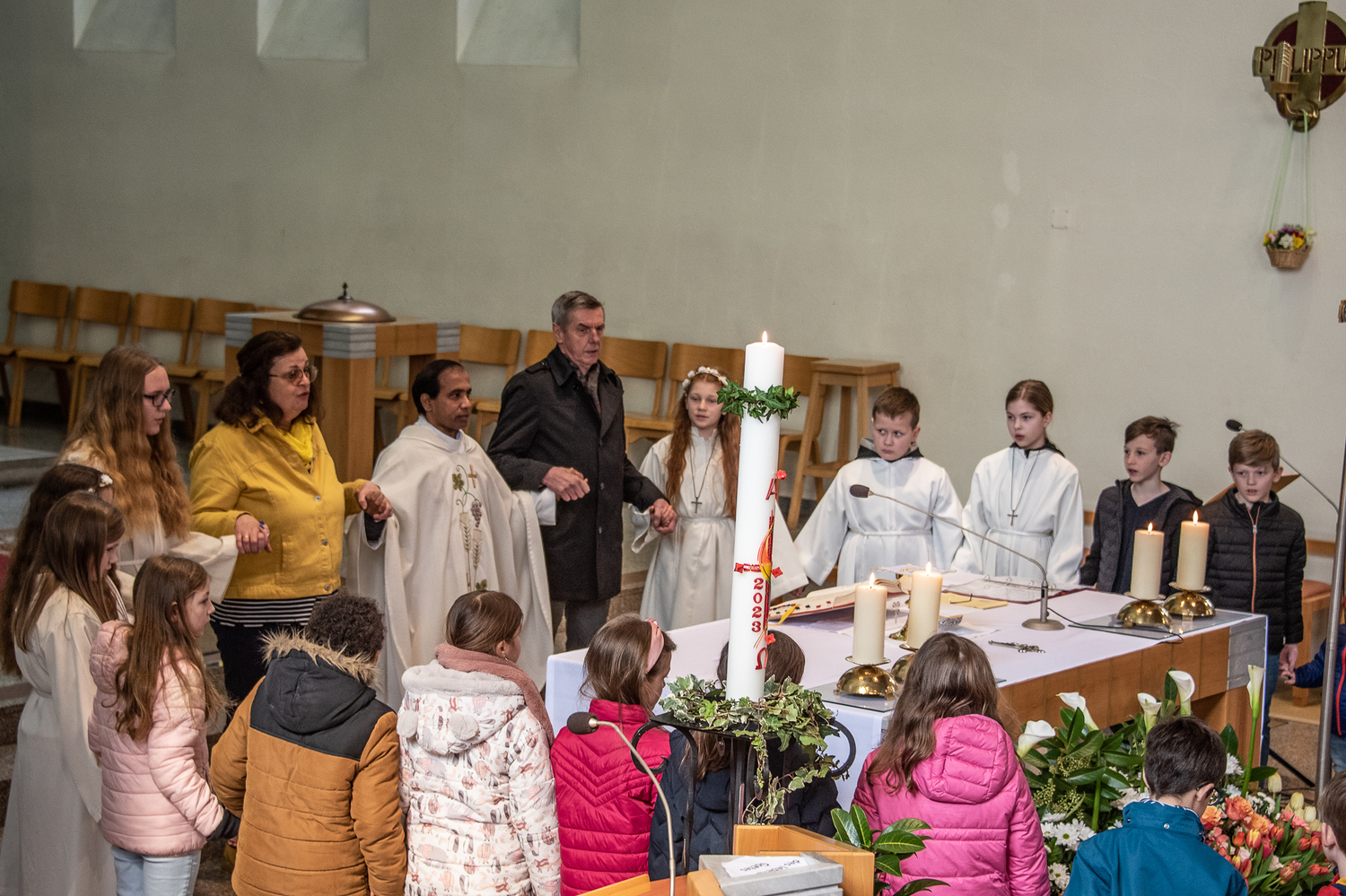 In der Familienmesse am Ostermontag steckten die Kinder alle Gottesdienstbesucher mit ihrer Freude an. Dazu trugen auch die Lesungen von der Verwandlung der Emmaus-Jünger, die Geschichte von Raupe und Schmetterling und besonders die Prozession durch die Kirche bei. Die Lieder wurden von der Musikgruppe Arabesque wieder so fröhlich und wunderschön gesungen.