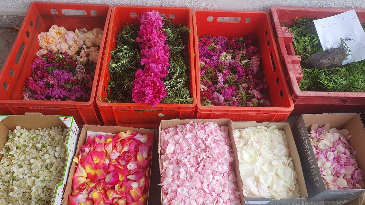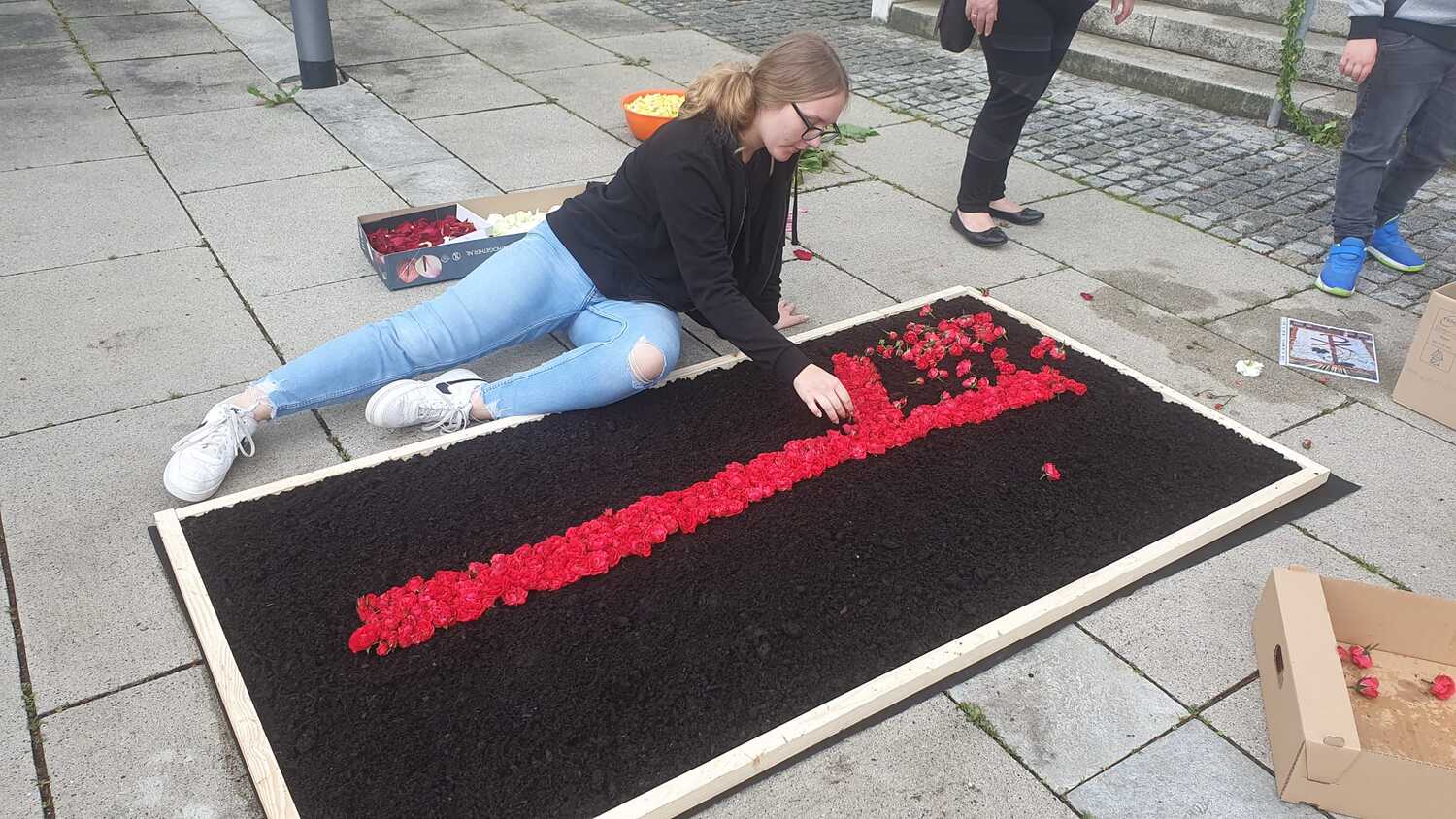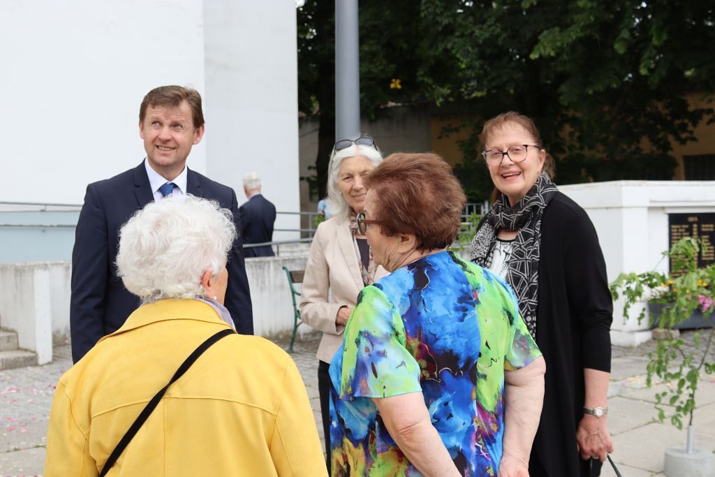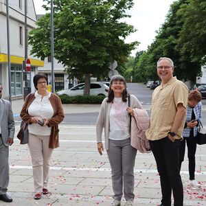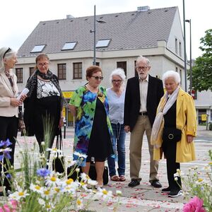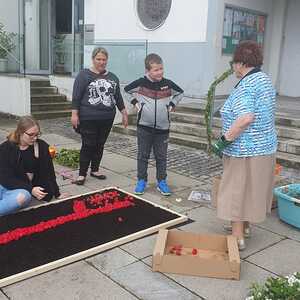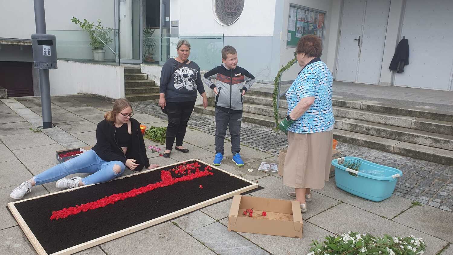 Der geschmackvolle Blumenschmuck, die Musik der Stadtkapelle, das Tragen des Himmels von Vertreter:innen des Gemeinderates, das Blumenstreuen und Singen der Kinder und die ausgewählten Texte und Gebete trugen zur feierlichen Atmosphäre bei. Erstmals wurden auf Initiative von Pfarrgemeinderätin Irene Steiger mit Hilfe von den Ministrant:innen und einigen Frauen und Männern zwei wunderbare Blumenteppiche am Kirchenplatz gestaltet.