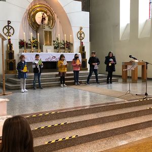 Viele Besucher, besonders Familien, waren zur Familienmesse gekommen. Pater Rayappan verkündete zusammen mit drei Kindern das Evangelium von den Jüngern, die Jesus auf dem Weg nach Emmaus begegneten. Sie waren Zeugen der Auferstehung und sagten die freudige Botschaft weiter. Und genau das taten in der anschlie0enden Prozession kleine und größere Kinder, Ministrantinnen, Priester und auch Erwachsene: sie sangen mit Begleitung der Musikgruppe "Sagt es allen weiter: Jesus lebt!" Dazu klangen auch die Glöckchen in den Händen. In den Gesichtern konnte man die Osterfreude lesen.