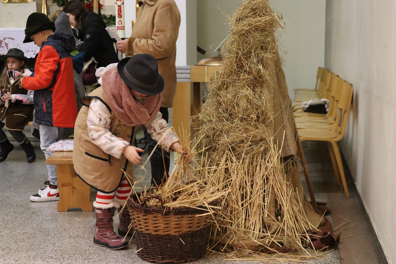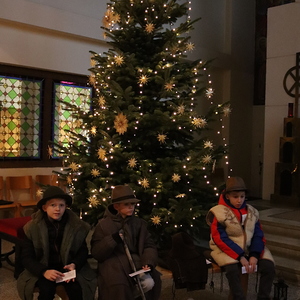 Ganz besonders viel Mühe gaben sich die Kinder am Heiligen Abend in der Kindermette. Sie verkündeten zusammen mit Pater Deiva das Evangelium von den Hirten, die auf den Feldern bei Betlehem sonderbare Zeichen und sogar Engel sehen. Die armen Hirten erzählten den Gottesdienstbesuchern, was sie in jener Nacht bewegte und wie sie Maria und Josef und das göttliche Kind fanden. Zu den Fürbitten legten sie Stroh in die Krippe, als Symbol für alles Armselige, scheinbar Wertlose, das Gott durch sein Wirken verwandeln kann. Die Musik von Arabesque machte die ganze Messe feierlich und stimmungsvoll, besonders als zum Schluss alle gemeinsam in der verdunkelten Kirche mit dem schönen, leuchtenden Christbaum das "Stille Nacht" anstimmten.