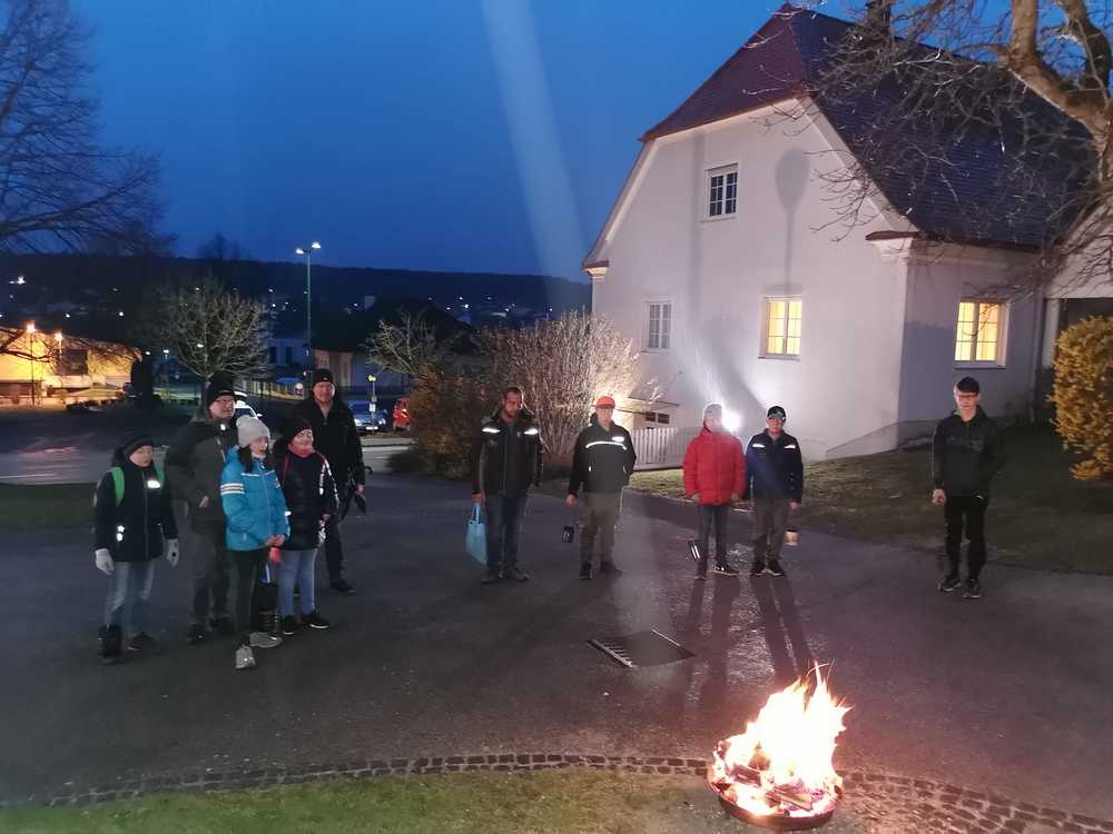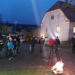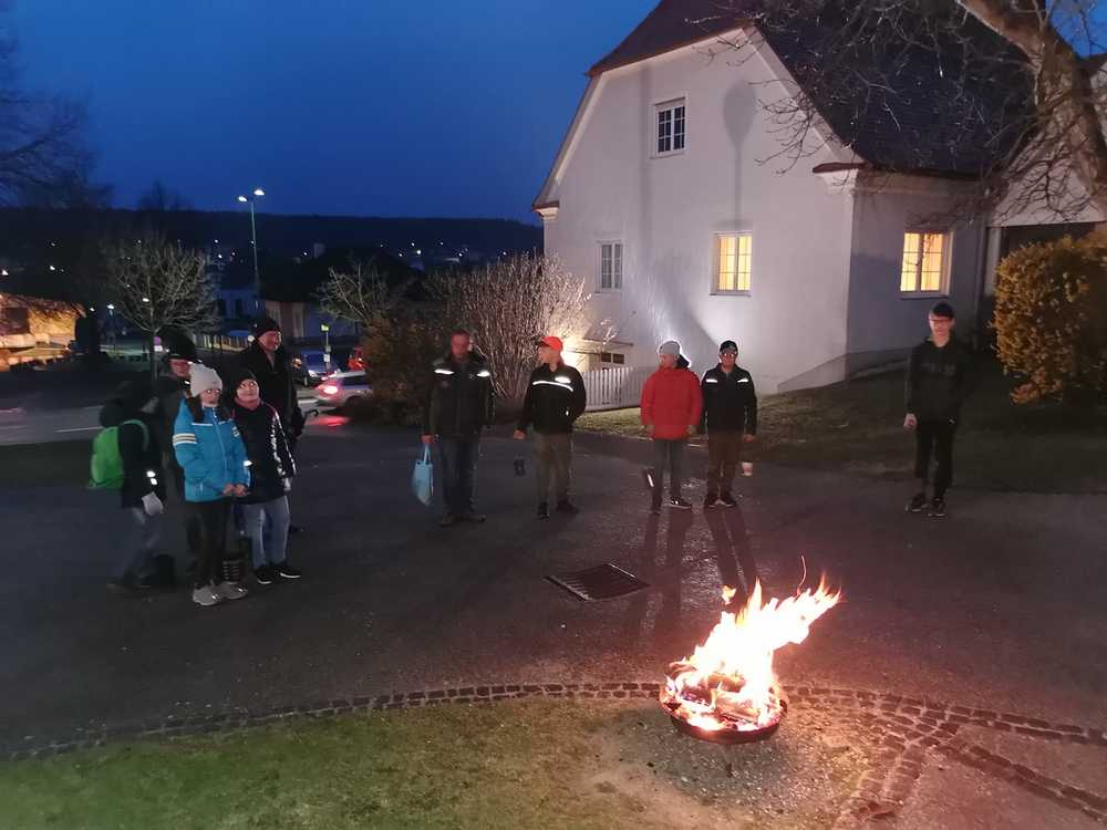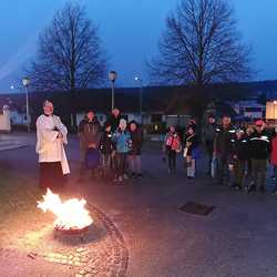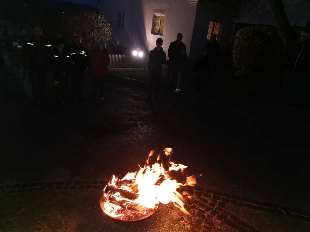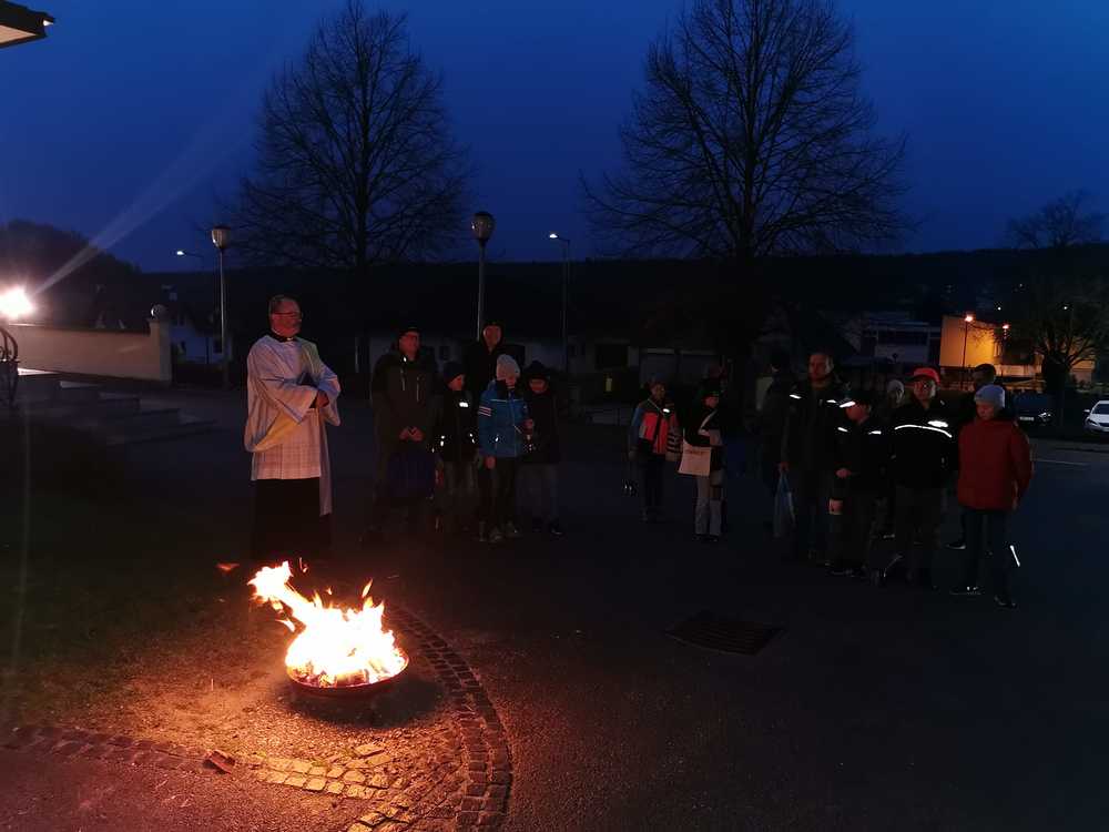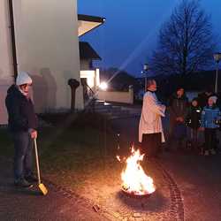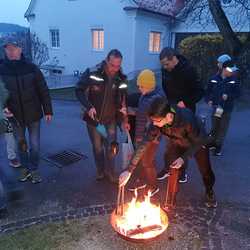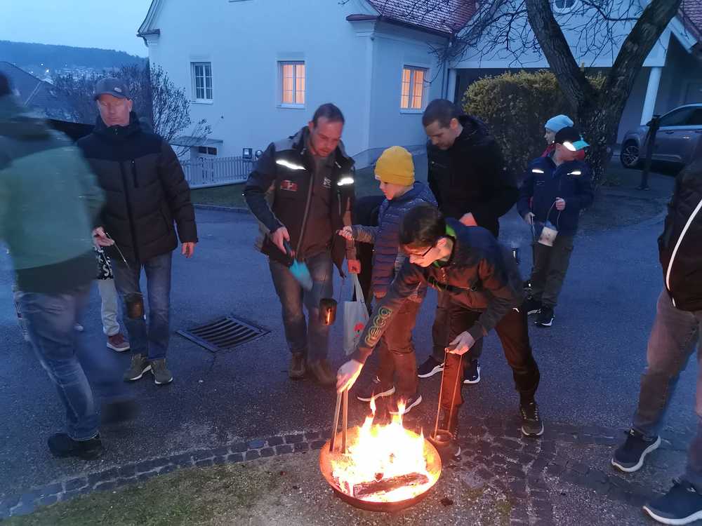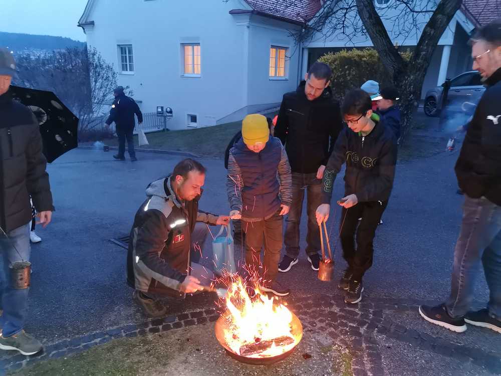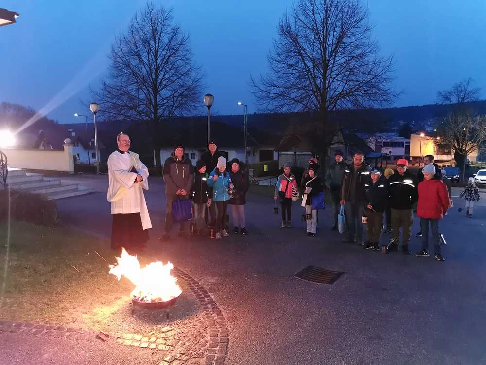 Am Karsamstag segnete Diakon Rudolf Exel um 6 Uhr das Feuer vor der Pfarrkirche. Im Anschluss trugen die Kinder das Feuer von Haus zu Haus um damit das Feuer in den Öfen wieder zu entzünden. Damit soll dann das Osteressen zubereitet werden.