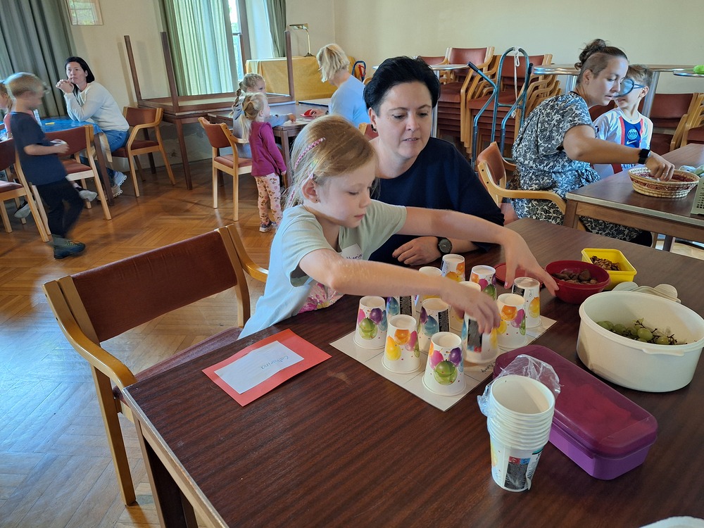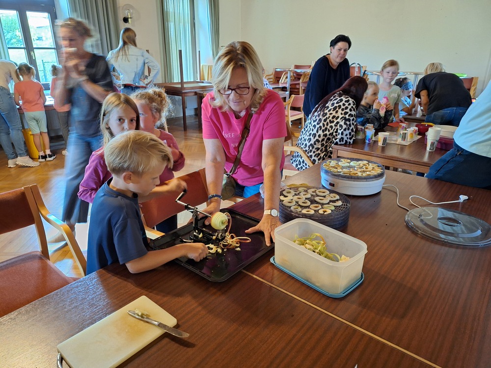 Bei den Stationen konnten die Kinder mit ihren Begleitpersonen die Äpfel mit einer speziellen Maschine schälen, Obst und Gemüse blind verkosten oder mit Kernen selbst ein Bild kleben.