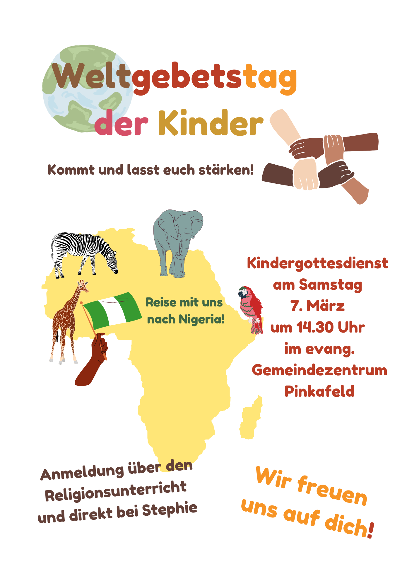 Reise mit uns unter dem Motto des Weltgebetstages "Kommt und lasst euch stärken!" nach Nigeria! Eine Anmeldung ist über den Religionsunterricht bzw. bei Stephie möglich.