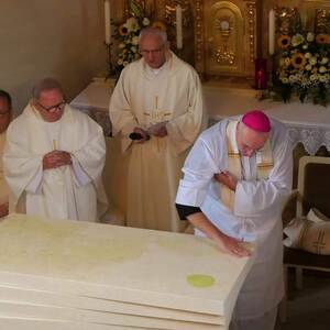In seiner Predigt legte Diözesanbischof die Bedeutung von drei Tischen dar: dem "Tisch des Wortes" (Ambo), der unser Christsein auf biblisches Fundament fußt, dem "Tisch des Brotes" (Altar), der uns Gemeinschaft mit und in Christus schenkt und den "Tisch der Menschen", ein Sinnbild für eine glaubhaft christliche Lebensführung in den Begegnungen mit unseren Mitmenschen.