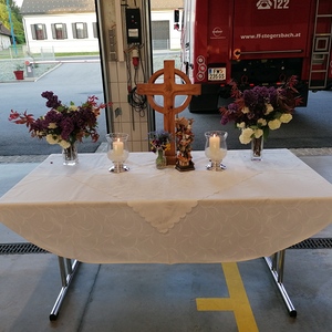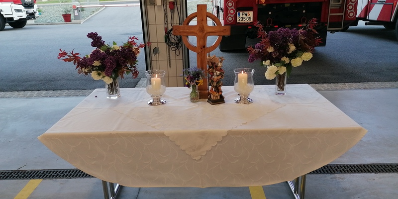 Am 02.05.2025 lud die Feuerwehr als Erster zur Maiandacht ein. Gestaltet wurde diese durch die Feuerwehrfrauen-und männer, wobei in gewohnter Weise Gerti Weiss  den Altar gestaltete.
